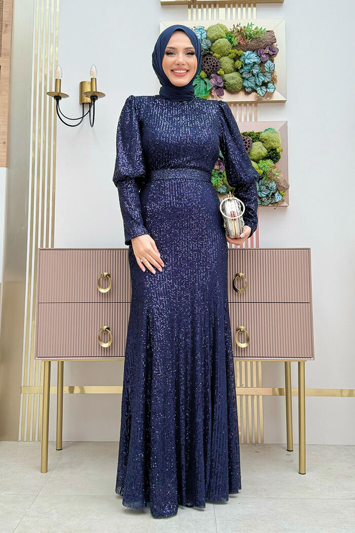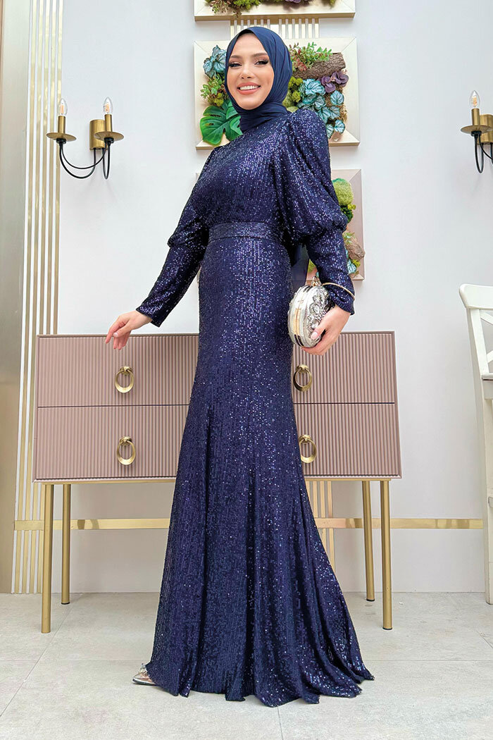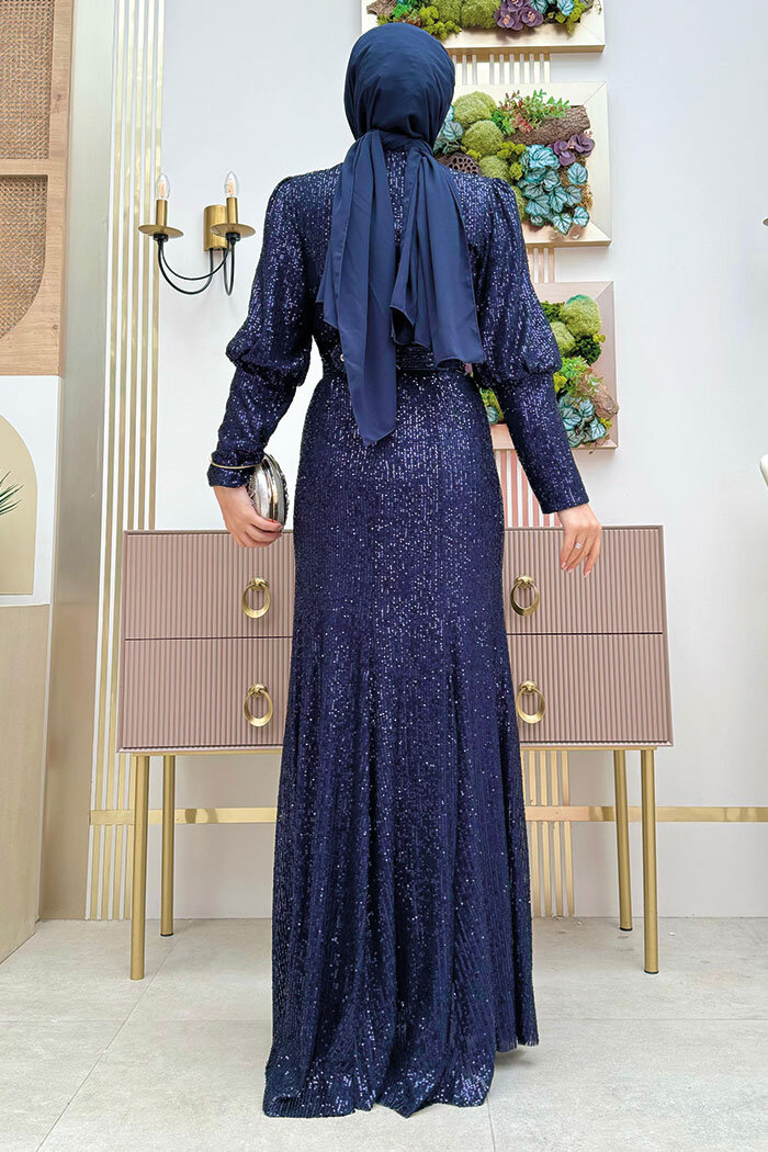 Kemer Aksesuarlı Pul Payet Balık Abiye Elbise 3858 Lacivert