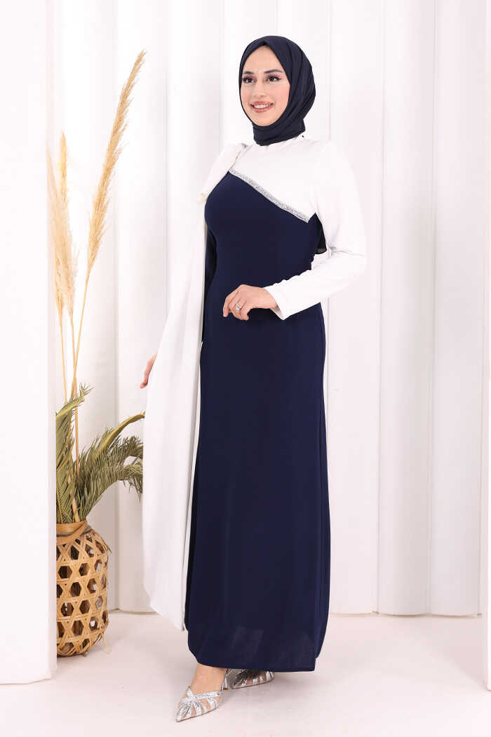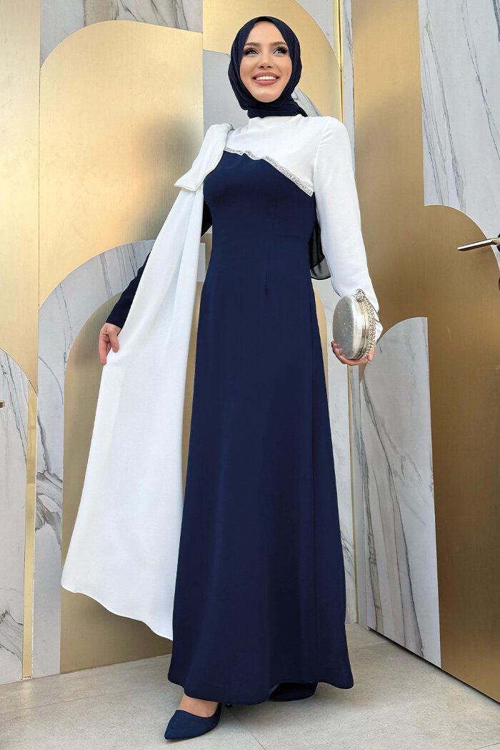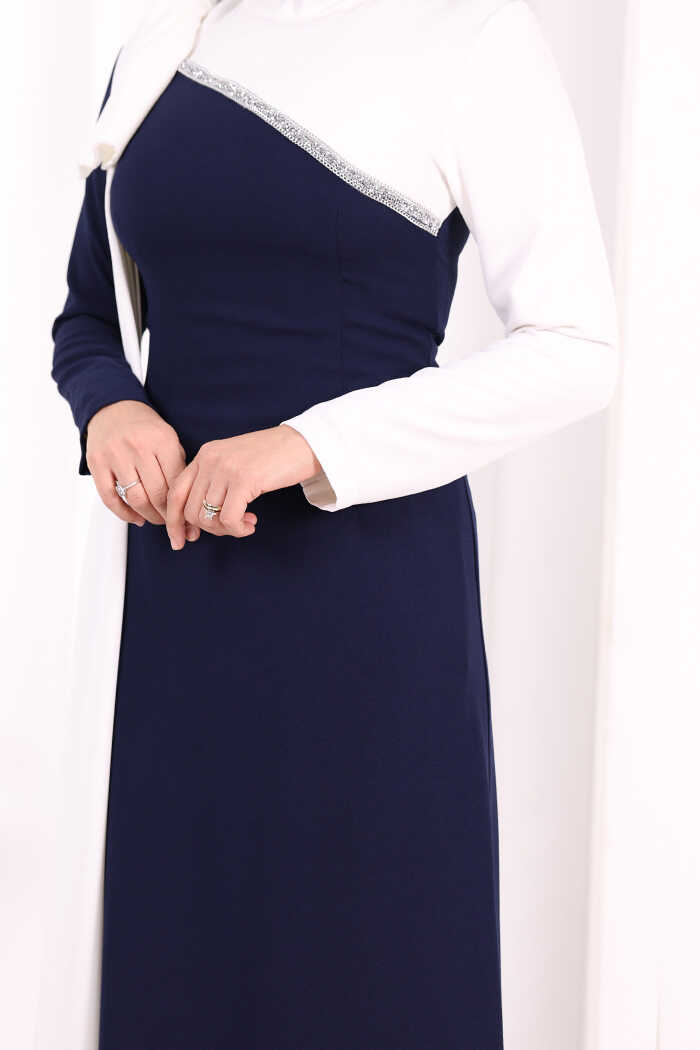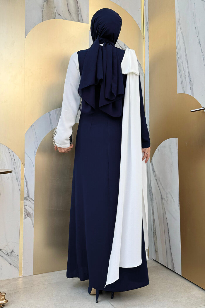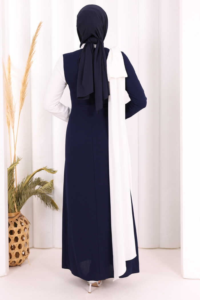 Tek Omuz Fiyonk Apoletli Çift Renk Elbise 3862 Lacivert