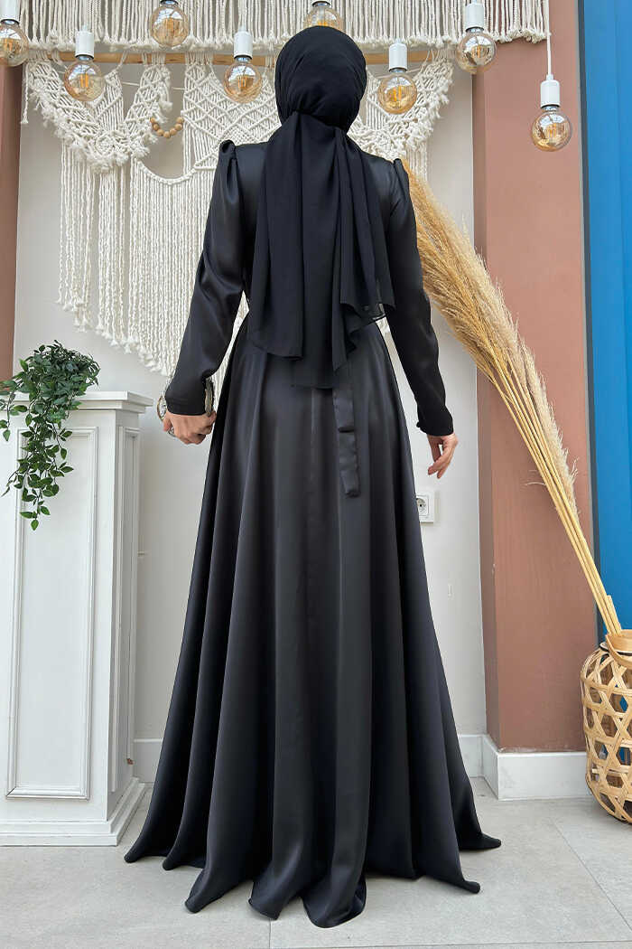 Taşlı Kemer Akseuarlı Saten Abiye Elbise 3863 Siyah