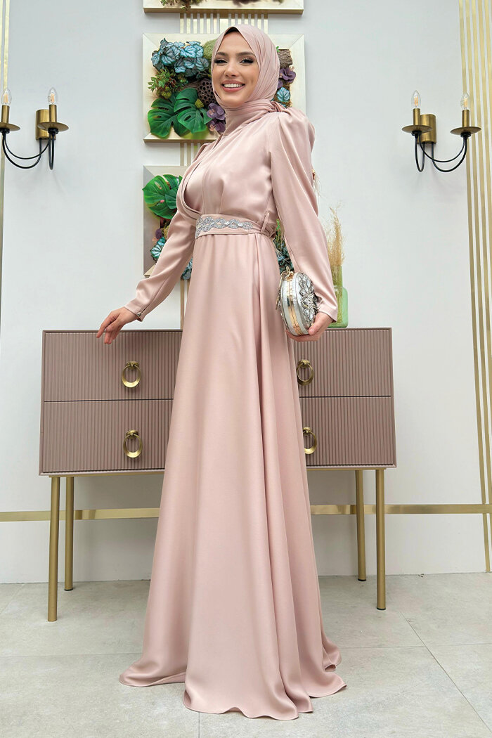 Taşlı Kemer Akseuarlı Saten Abiye Elbise 3863 Taş