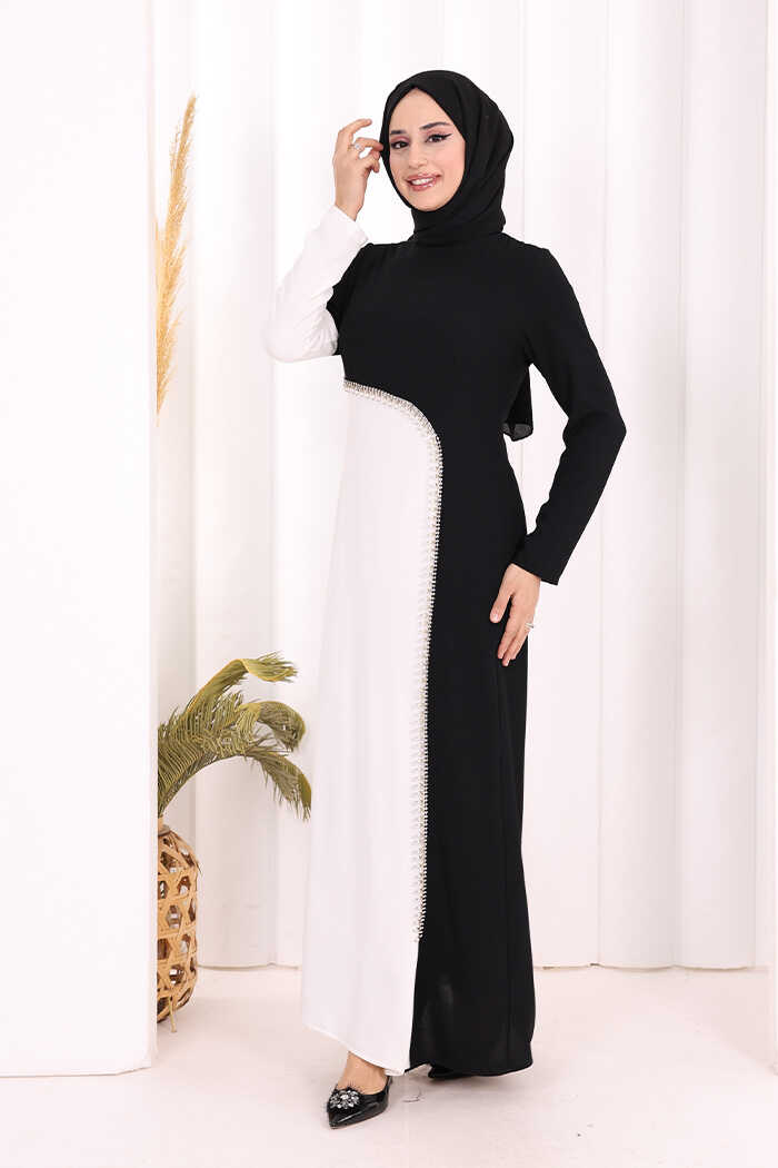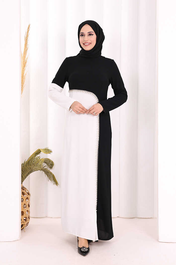 İKİ RENKLİ İNCİ DETALI ELBİSE: