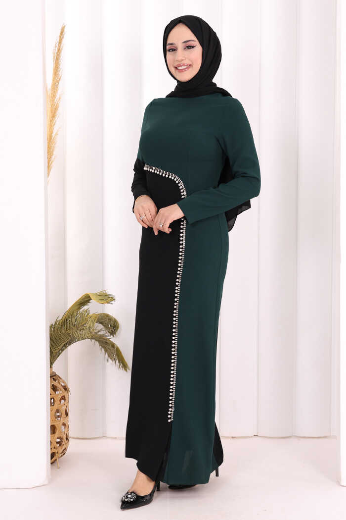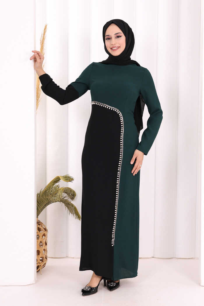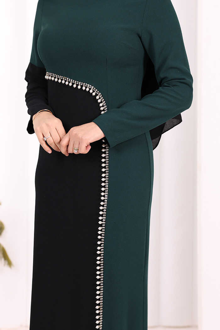 İki Renkli İnci Detaylı Elbise 3865 Zümrüt