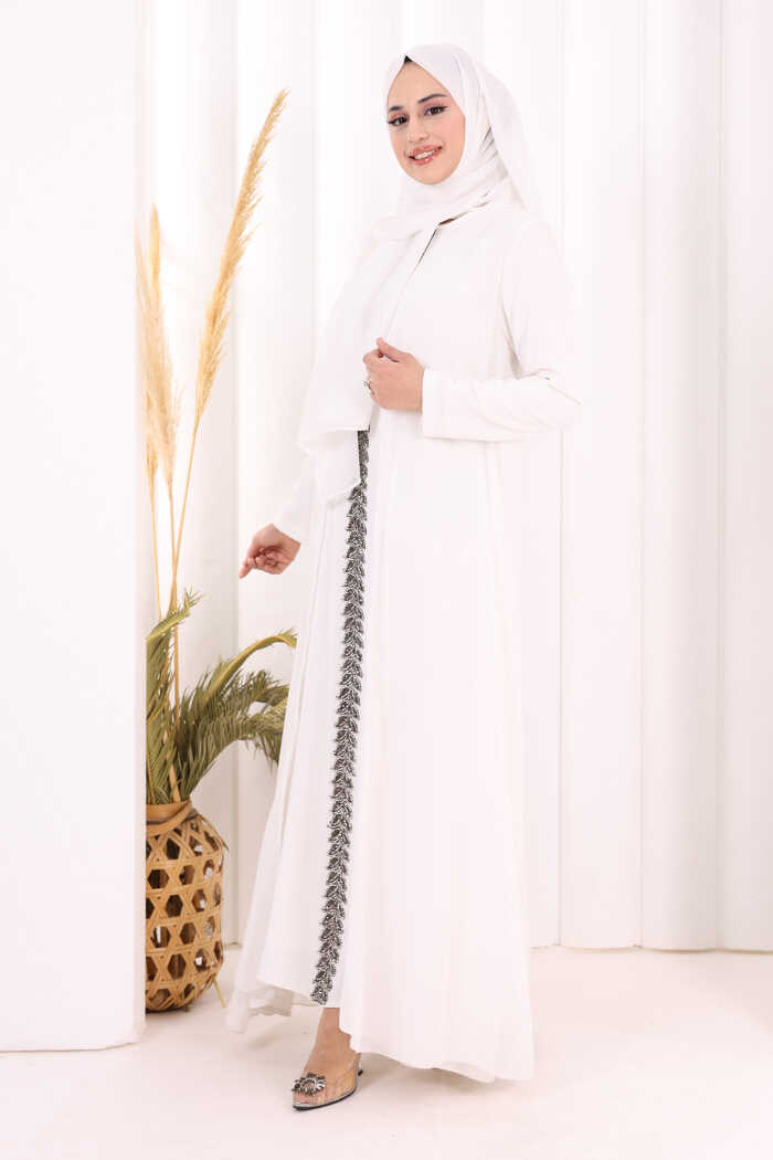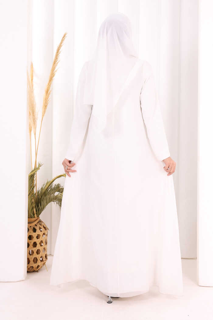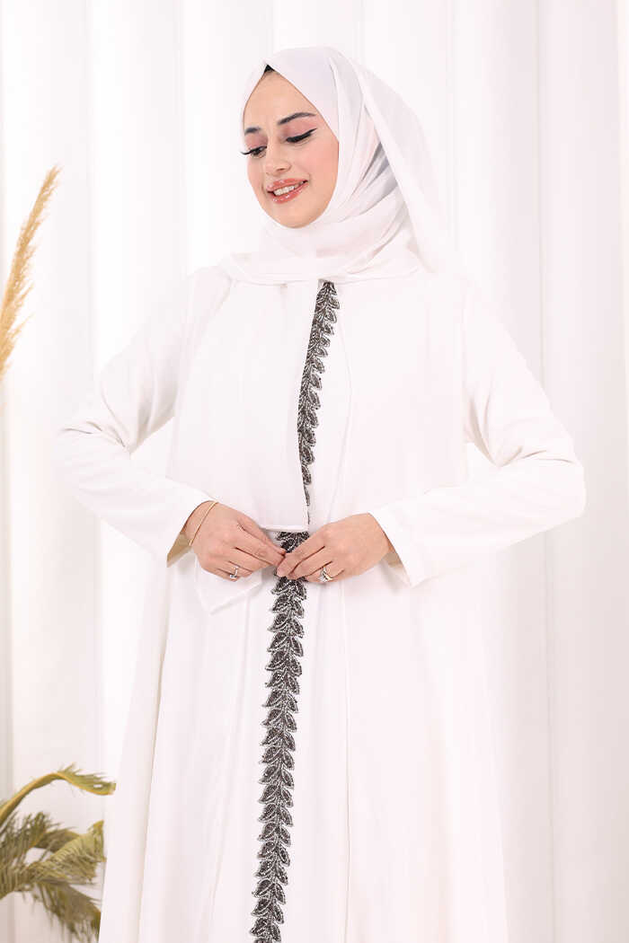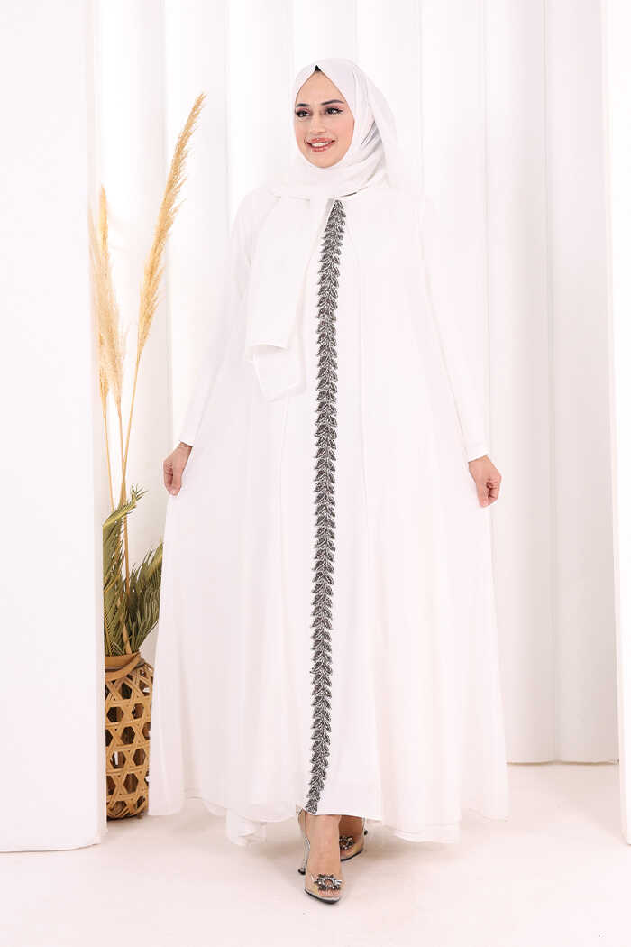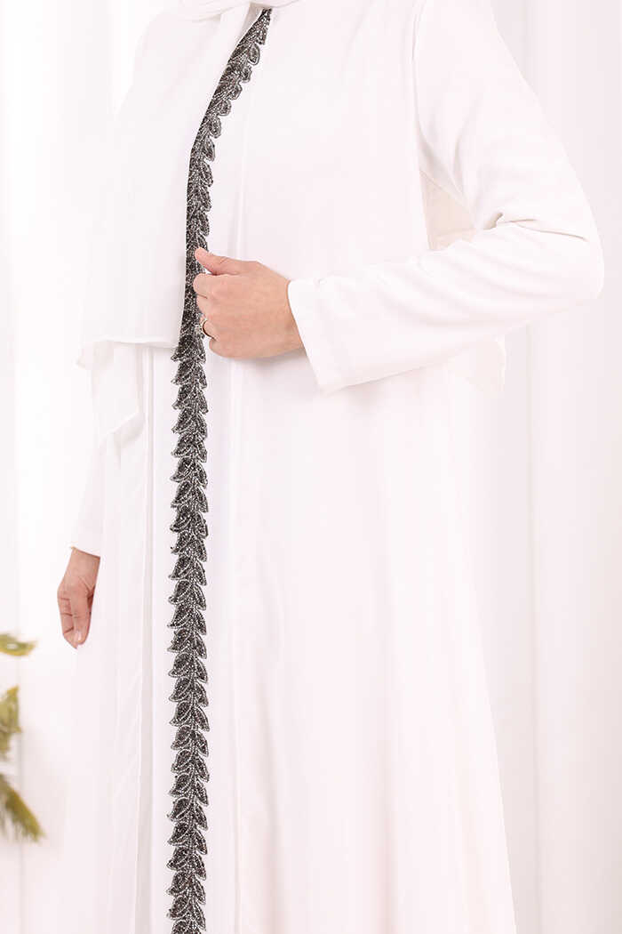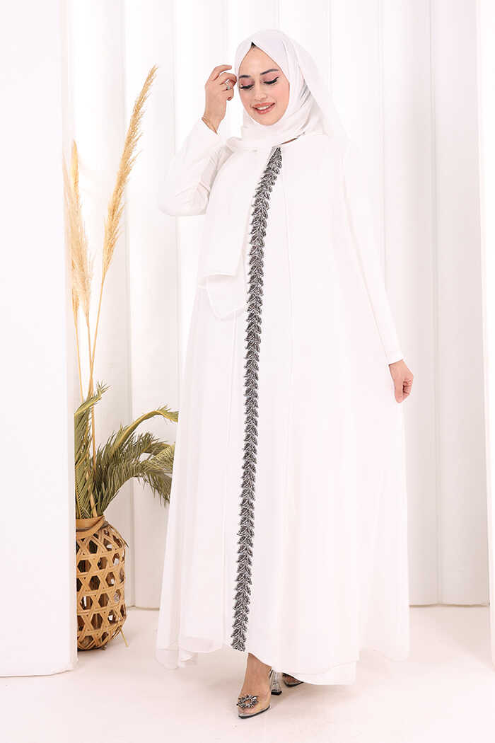 Pelerinli Ön Kısım İşleme Detay Elbise ŞAL HEDİYE 3868 Ekru