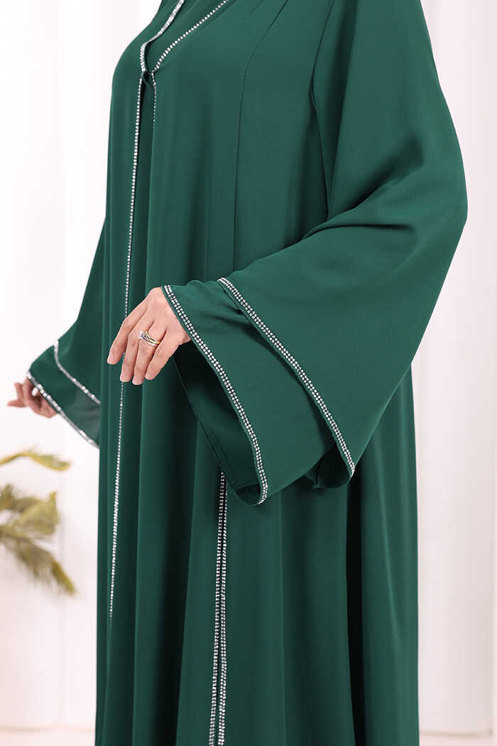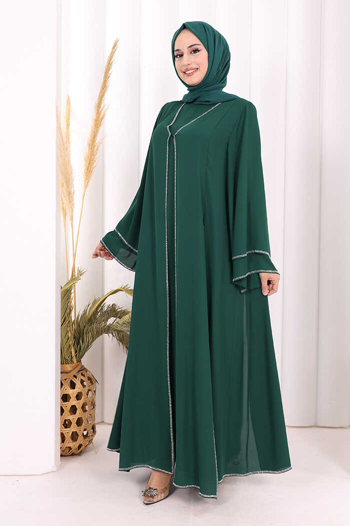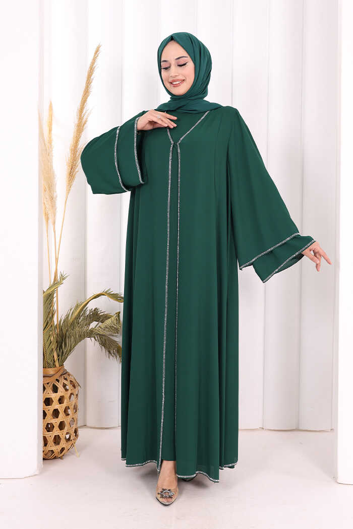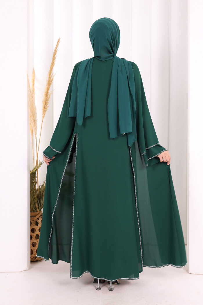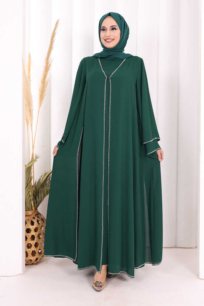 Taş İşleme Detaylı Elbise Abaya Takım 3873 Zümrüt