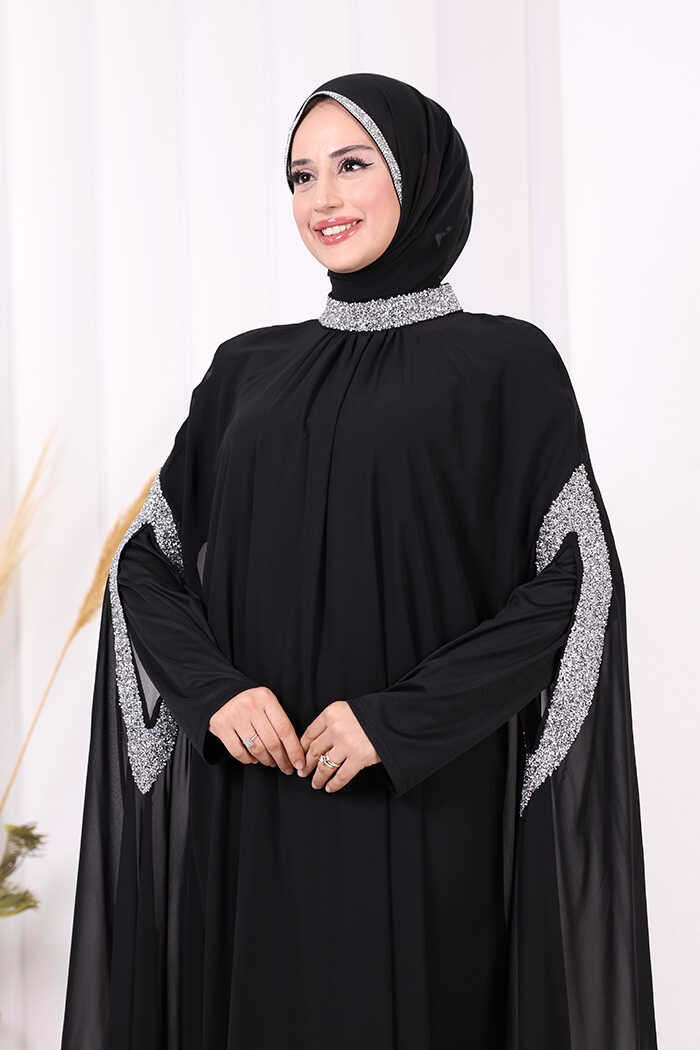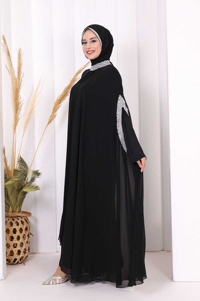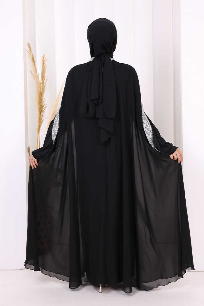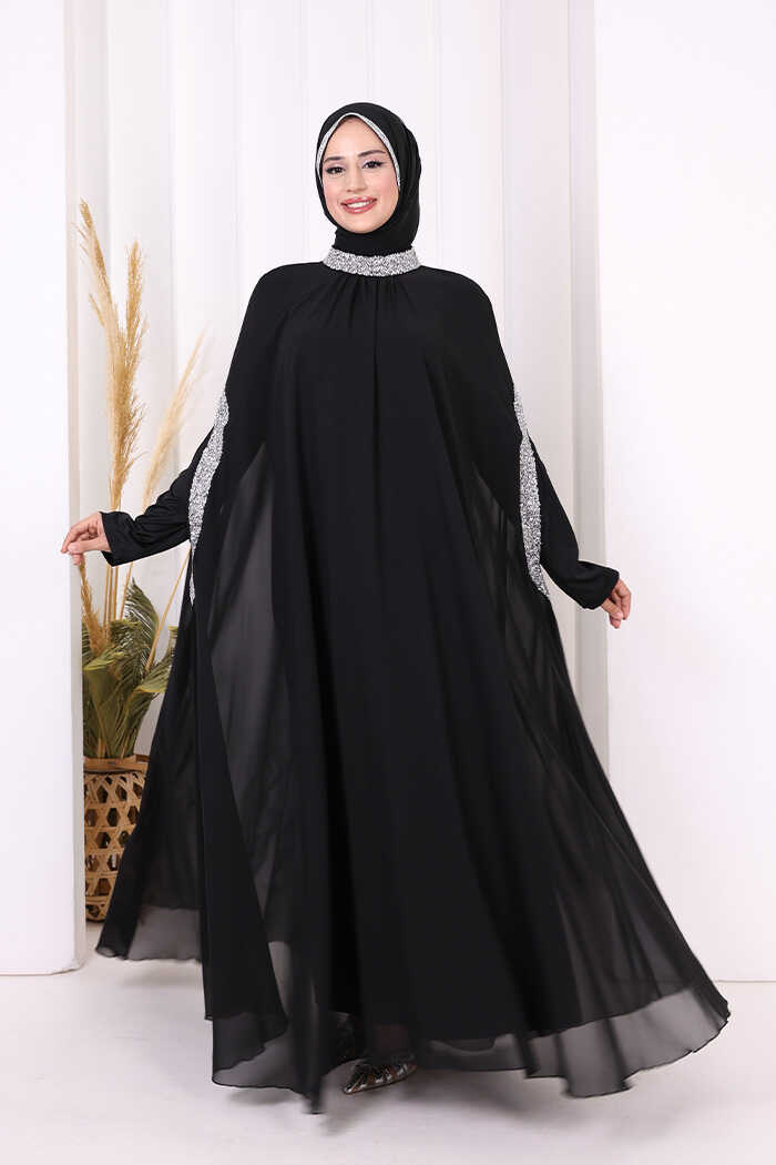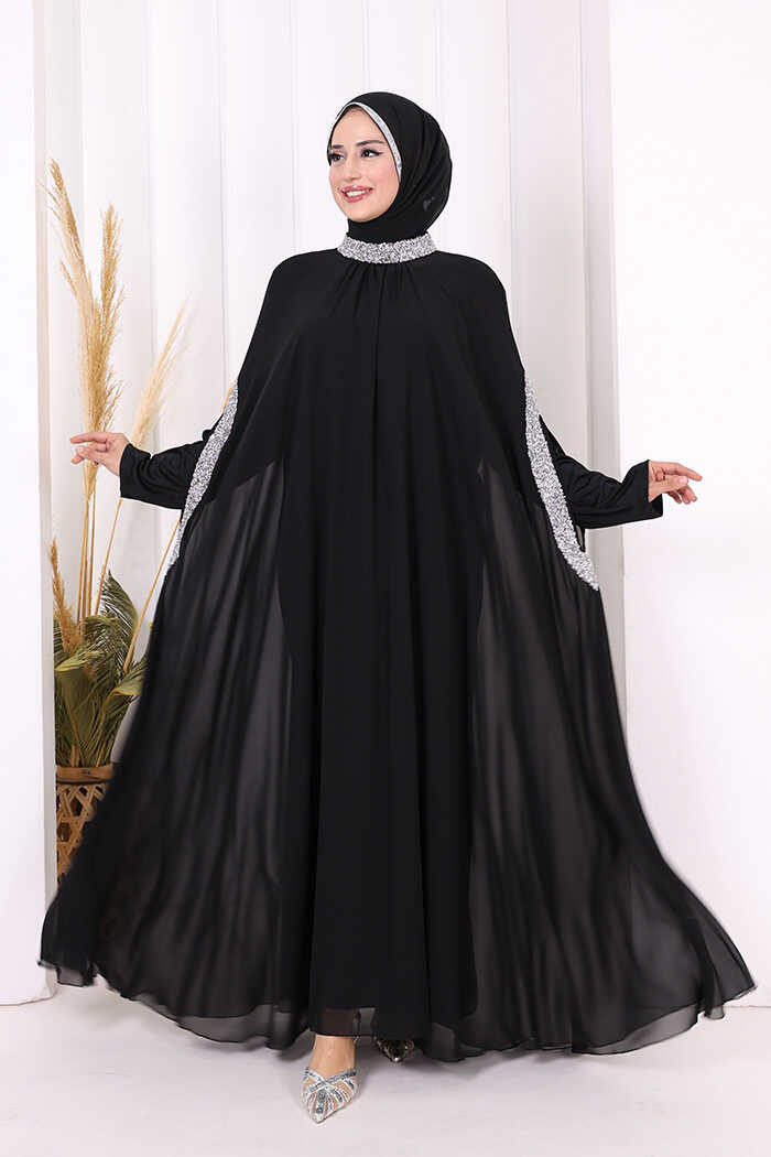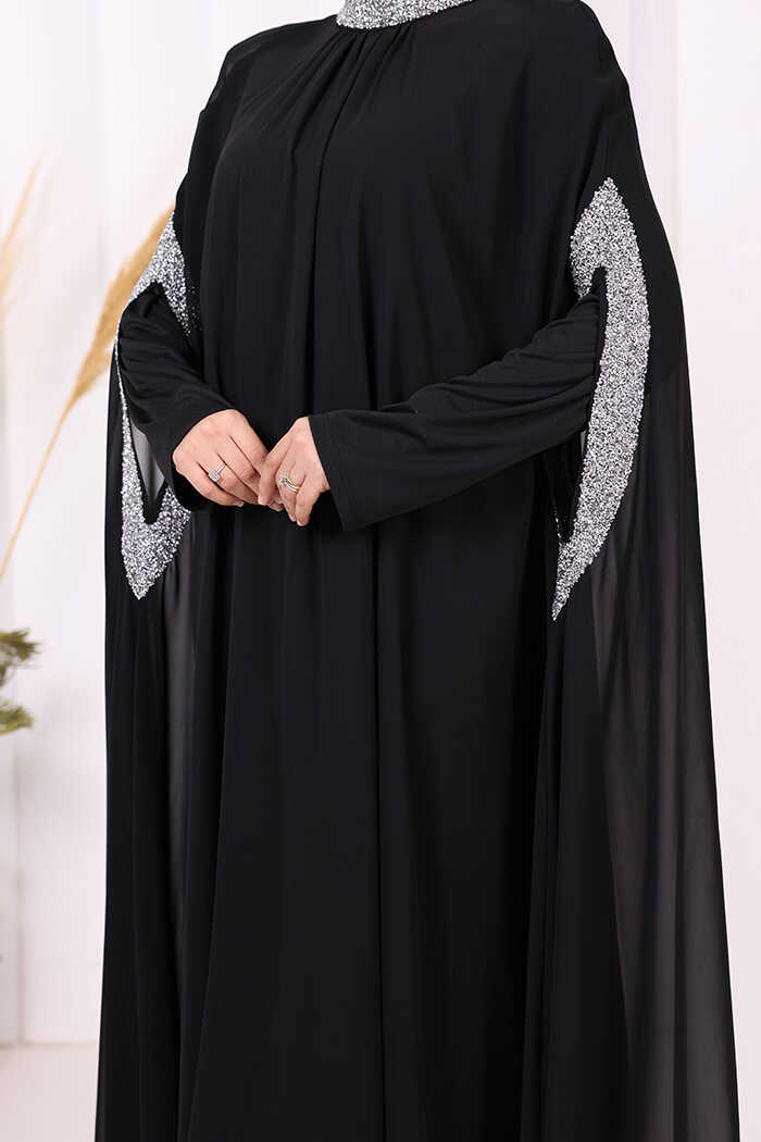 Taş İşleme Detaylı Elbiseli Pelerin Takım 3875 Siyah