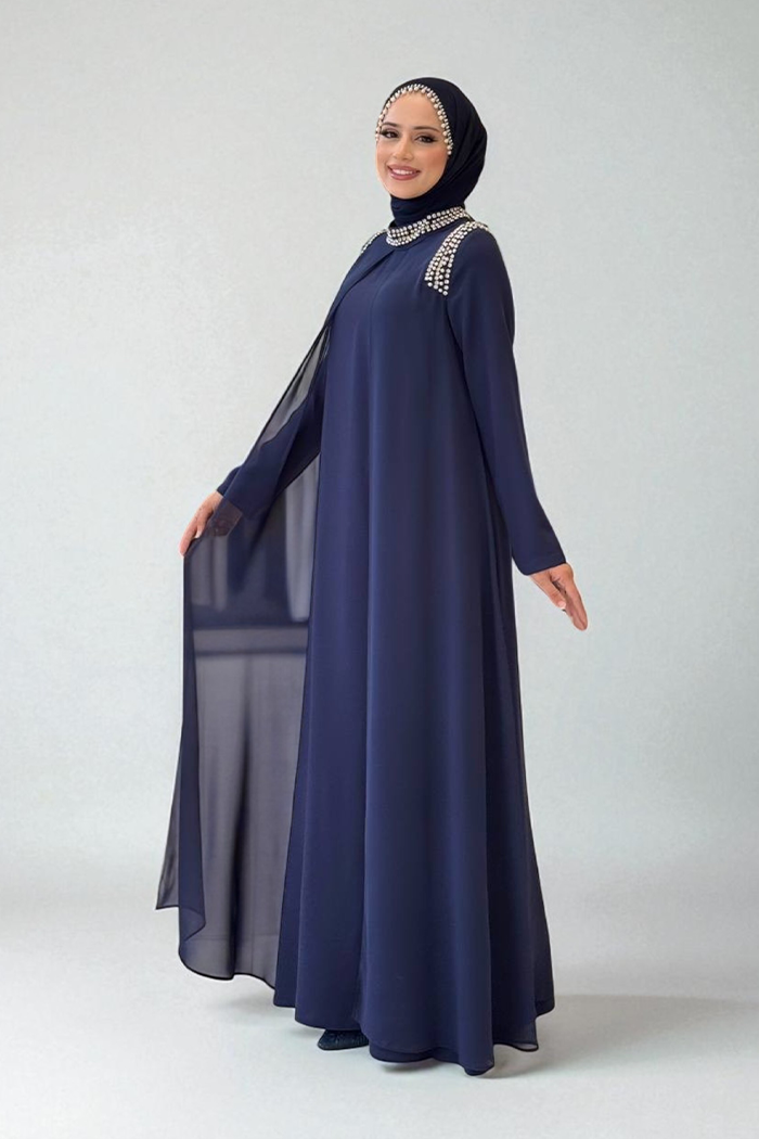 BOYUN VE OMUZ KISMI TAŞ İŞLEMELİ ŞİFON PELERİN DETAY ELBİSE