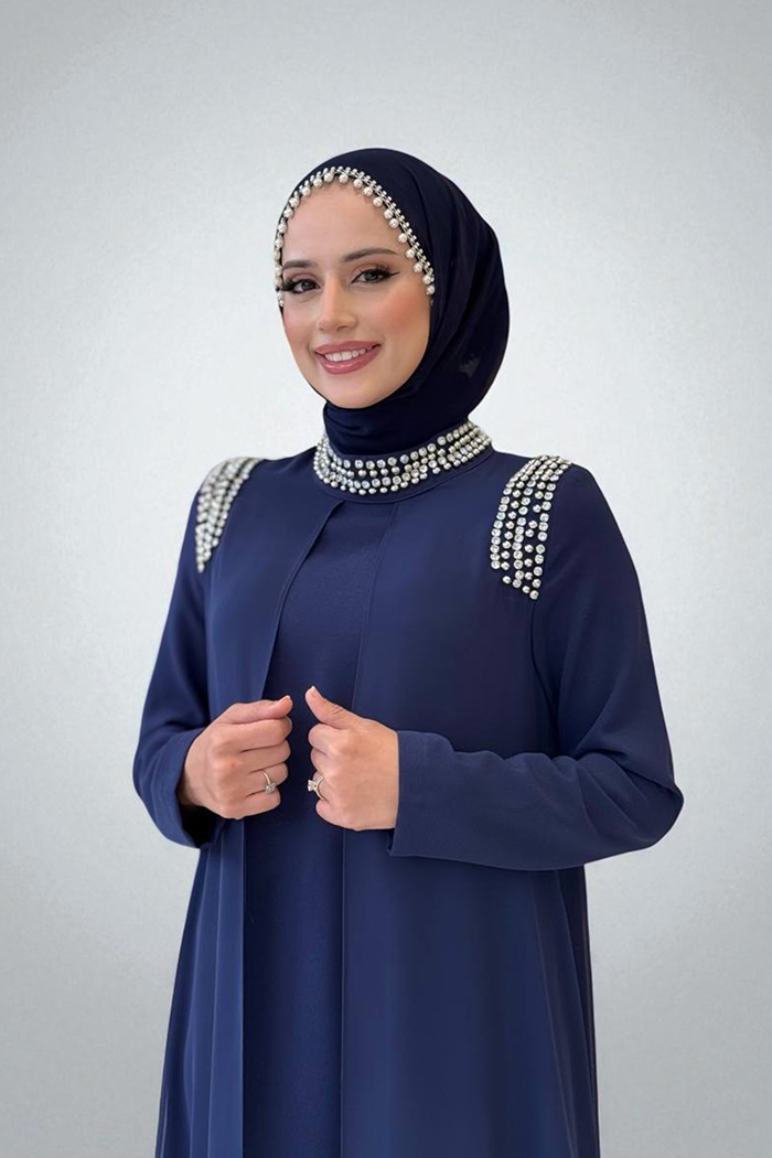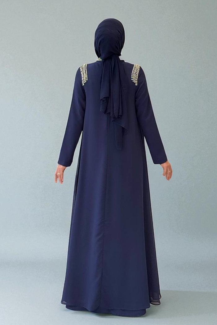 Boyun ve Omuz Kısmı Taş Detay Elbise 3876 Lacivert