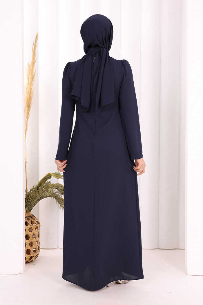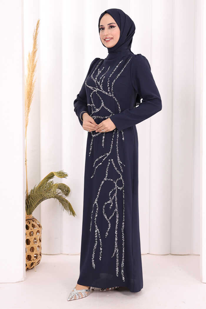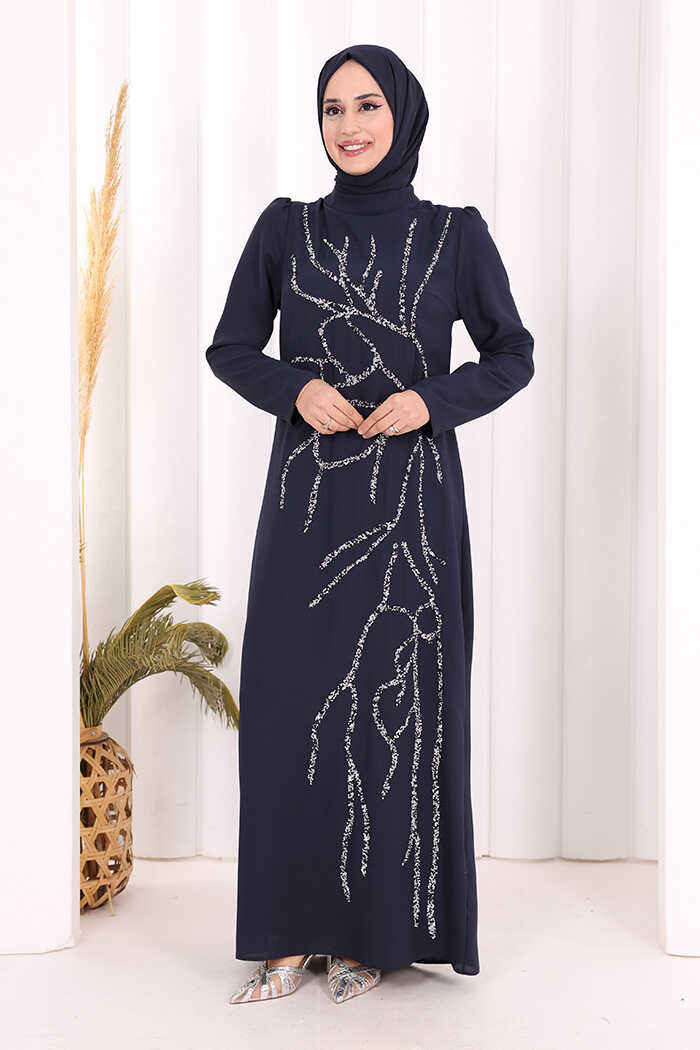 Taş İşleme Desenli Elbise 3889 Lacivert