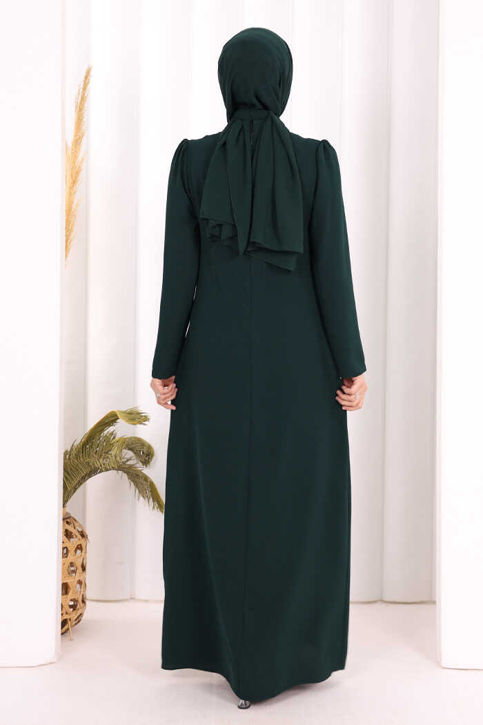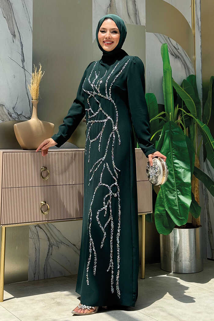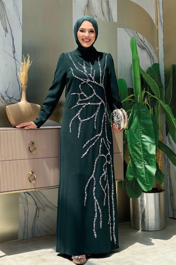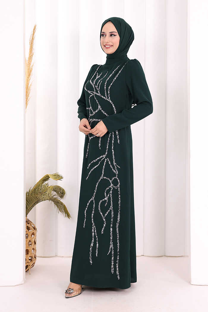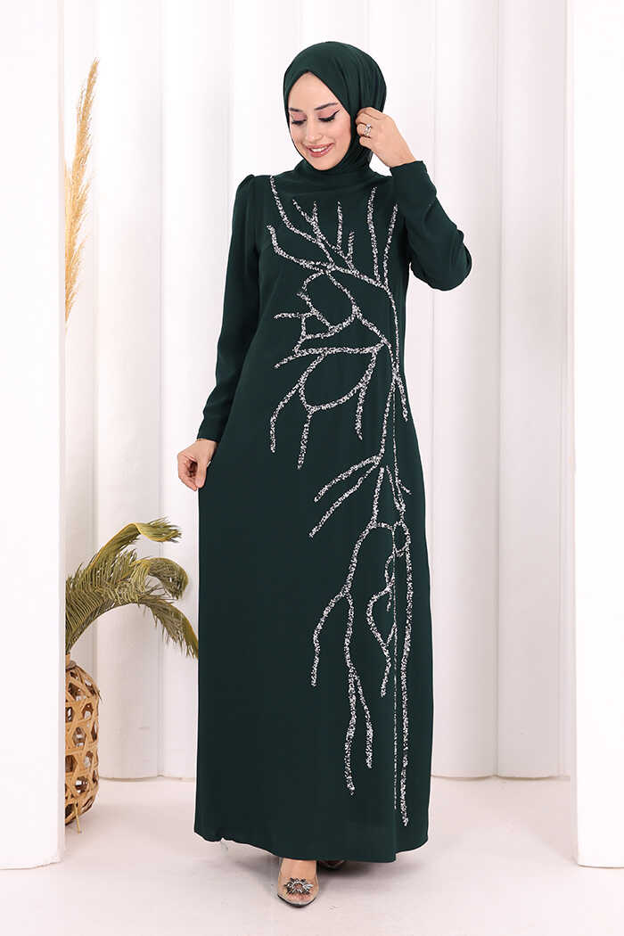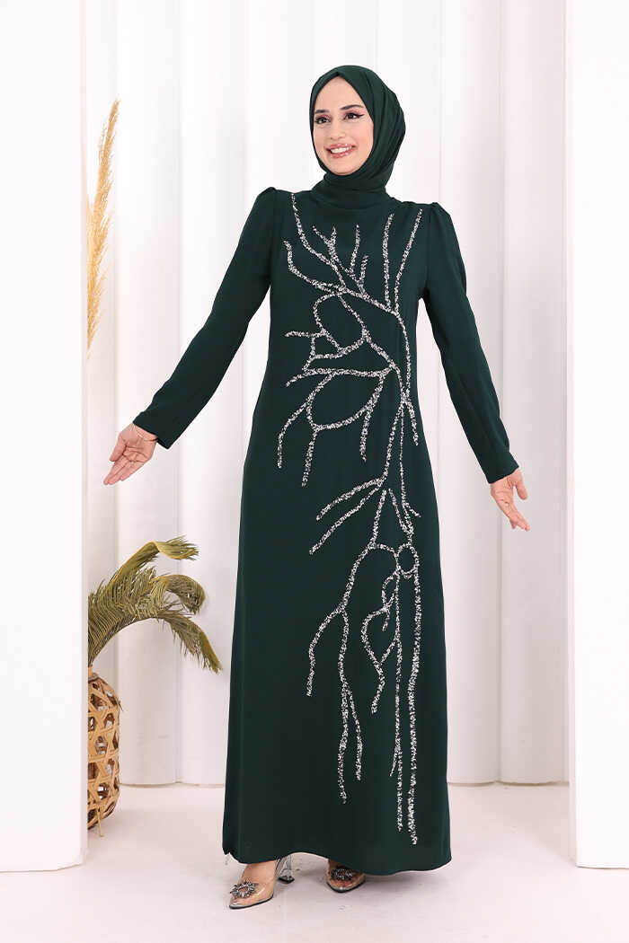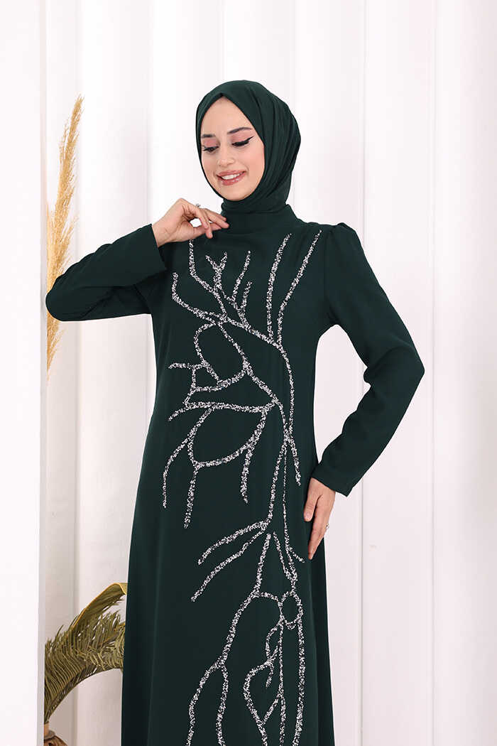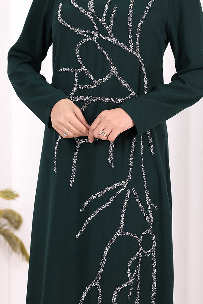 Taş İşleme Desenli Elbise 3889 Zümrüt
