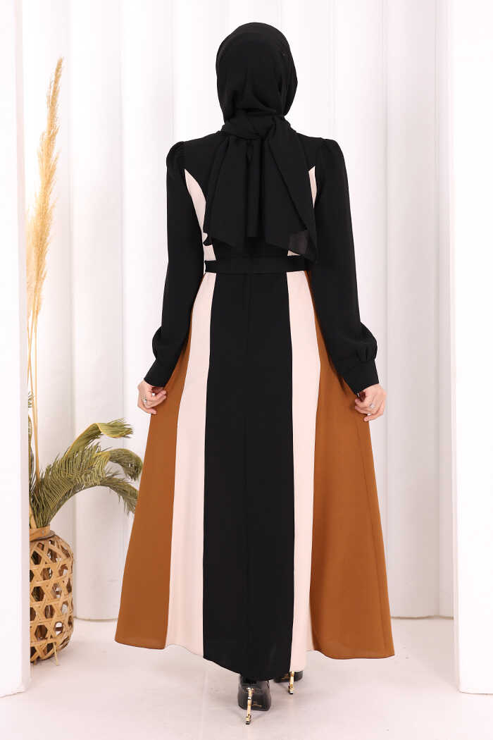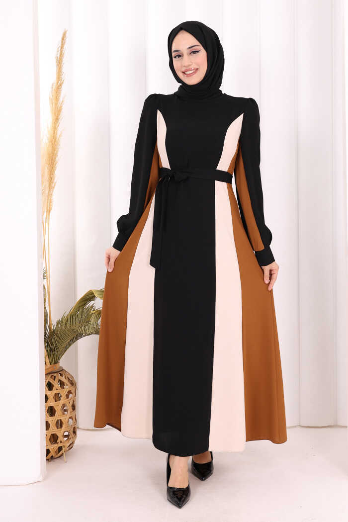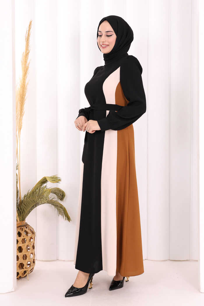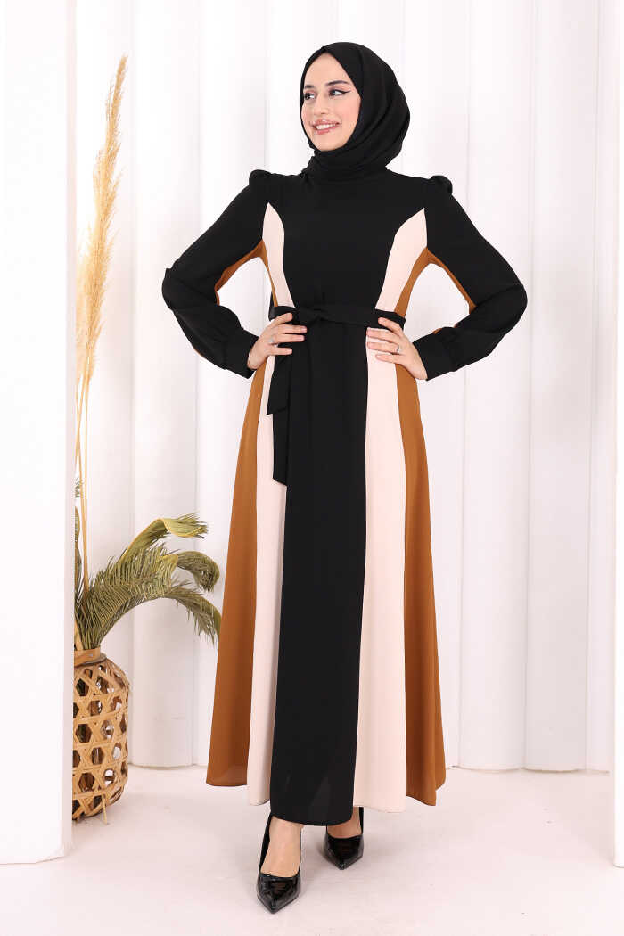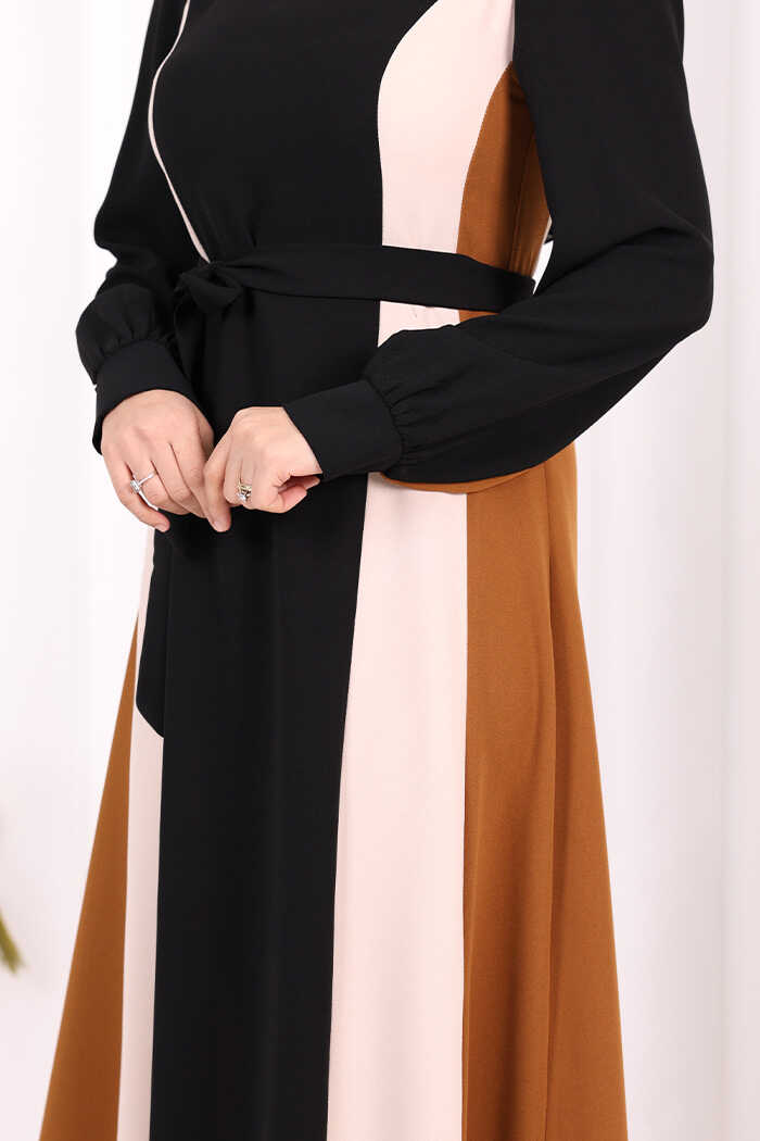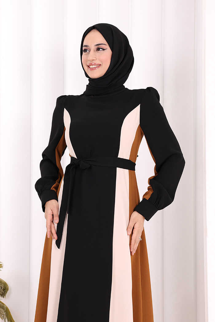 Bel Kuşaklı Üç Renk Elbise 3901 Siyah