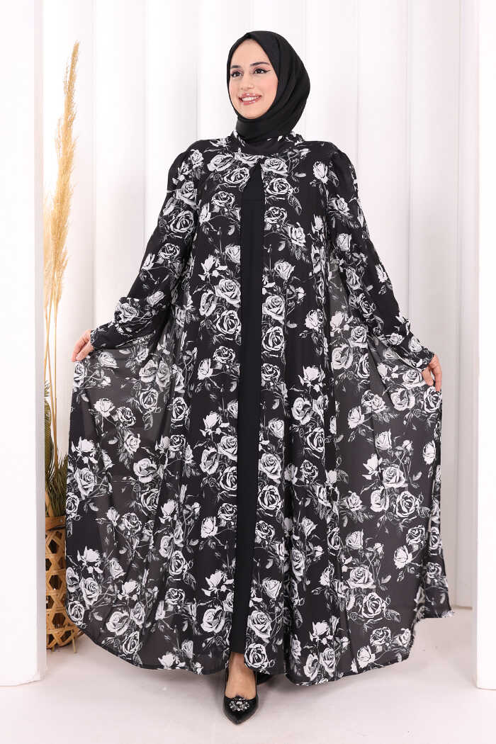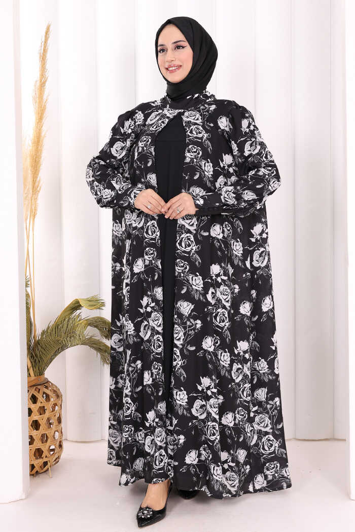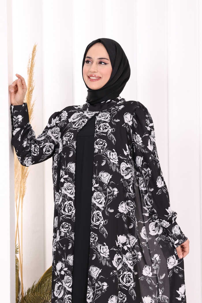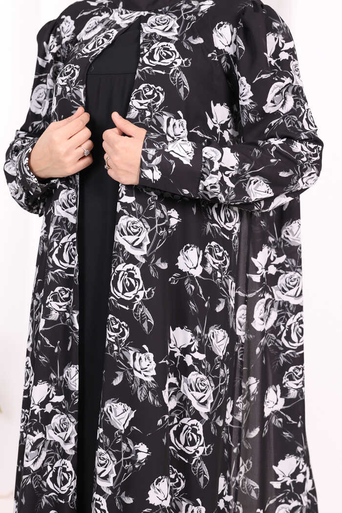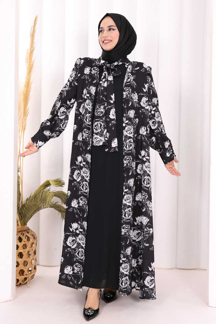 Boyun Bağcıklı Çiçek Desenli Abayalı Elbise Takım 3907 Siyah
