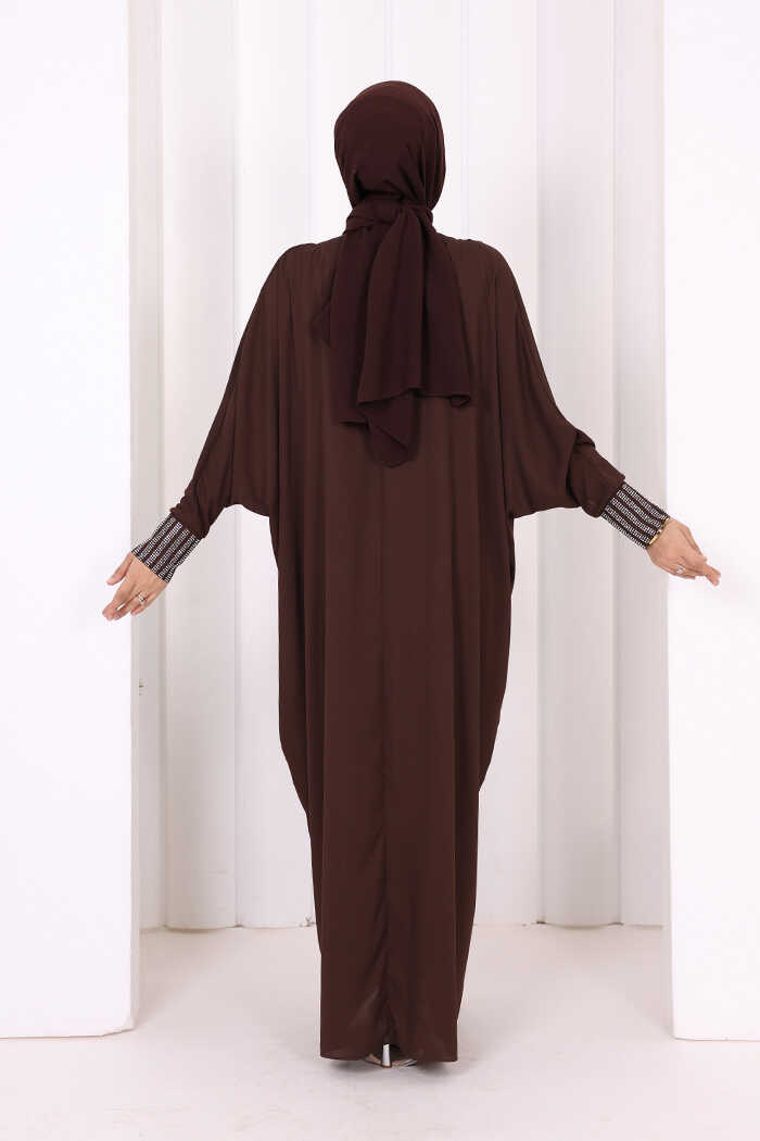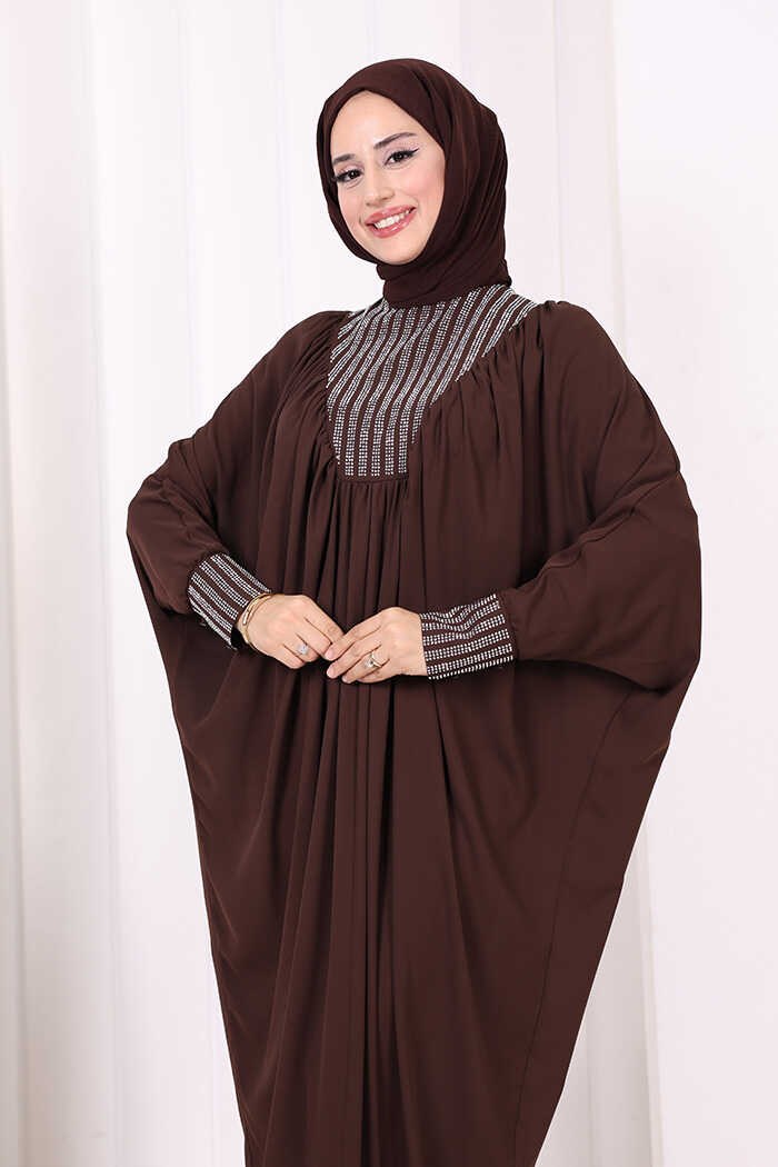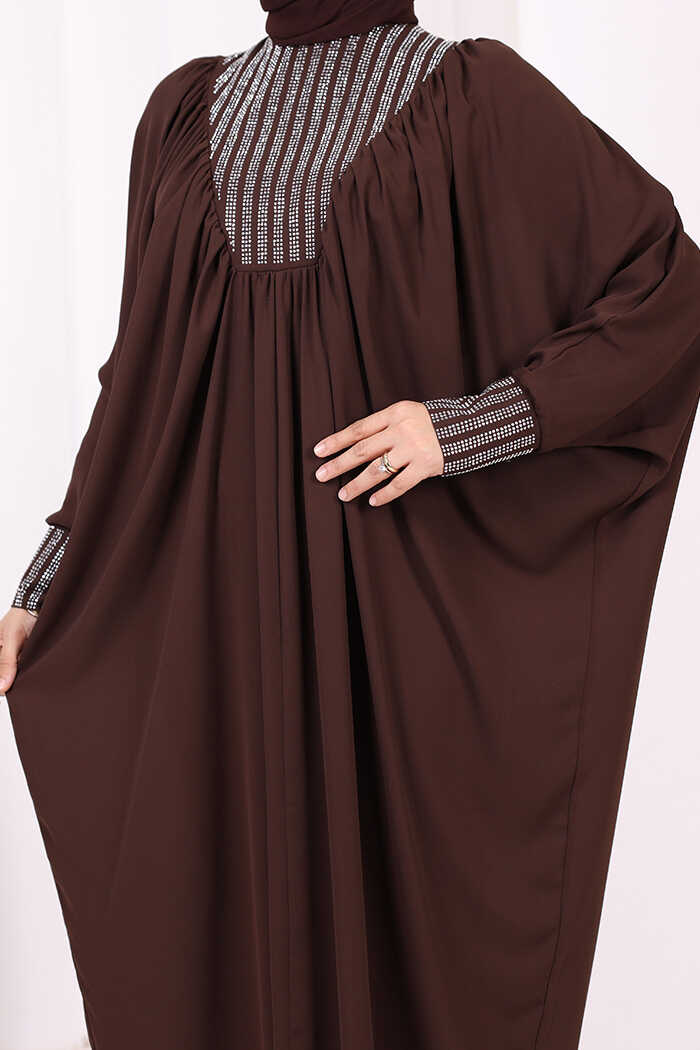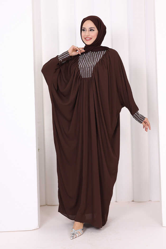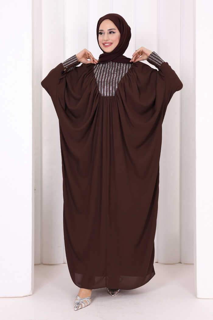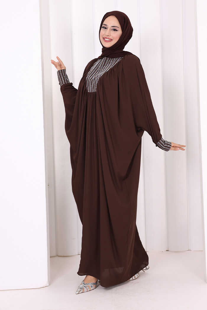 Taş Detaylı Yarasakol Elbise 3917 Kahverengi