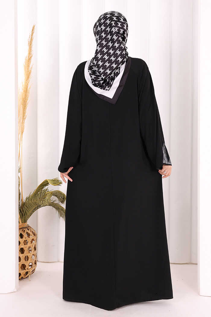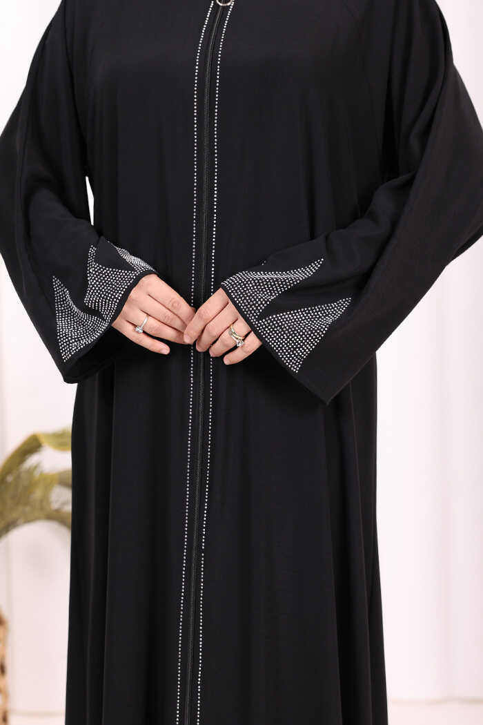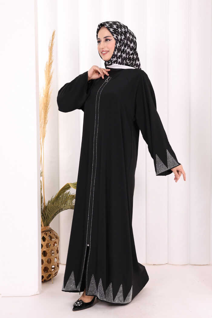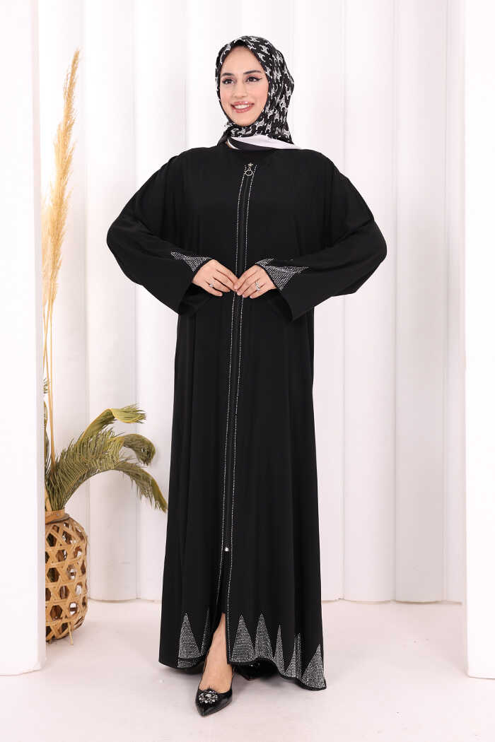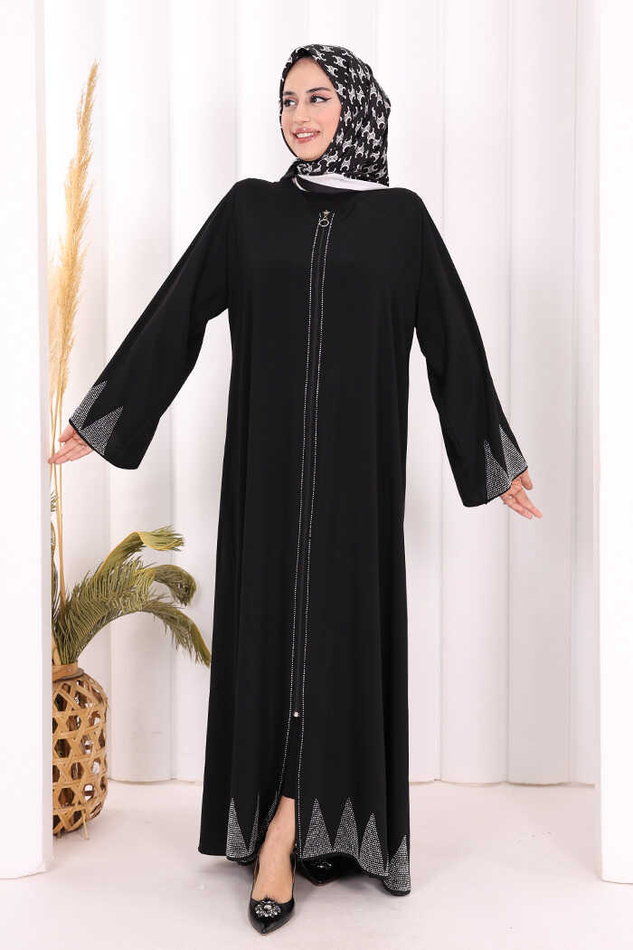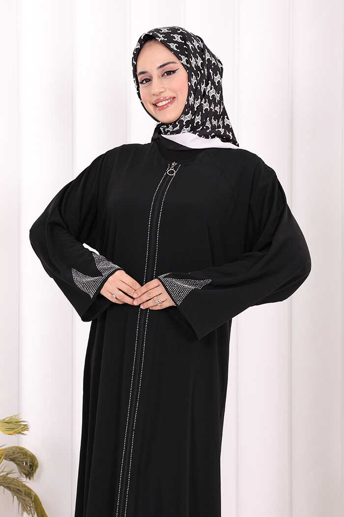 Taş Detaylı Fermuarlı Ferace 3918 Siyah-Gümüş