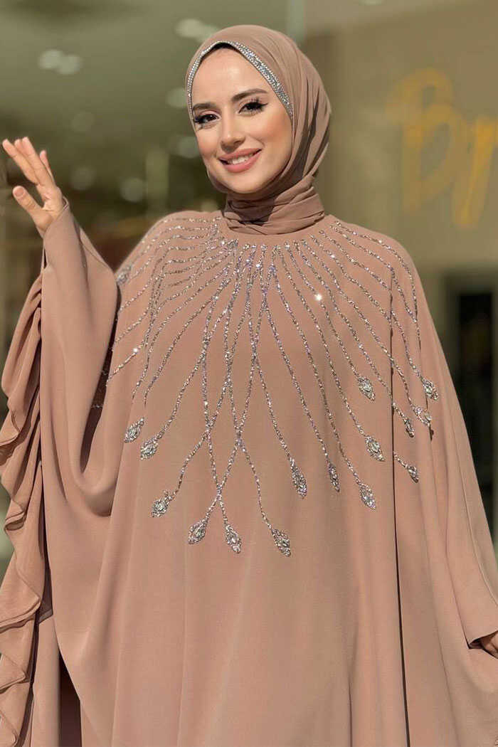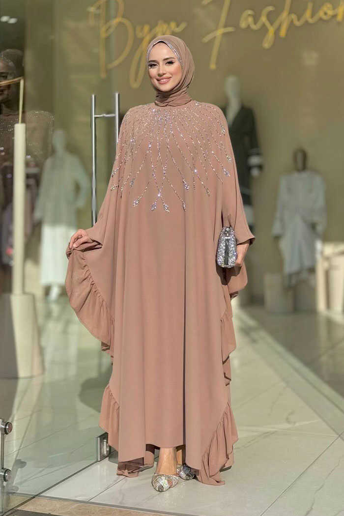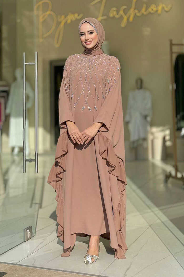Fırfırlı Taş Detaylı Elbise 3936 Vizon