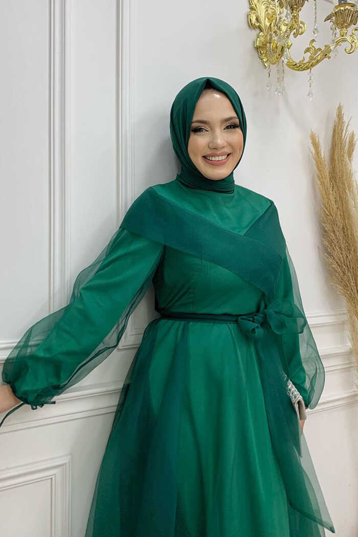 Evening Dress With Zipper Back. Waistbanded. There is a cross on the front and a lace detail on the sleeves. Lined Inside. Tulle Fabric. Size 38/46 Range Product Dimensions: Shoulder 38cm Arm 57cm Bicep 24cm Width 72cm Waist 62cm Height 146cm There Are 2cms of Play Between Our Other Sizes. The size on our mannequins is 40, with an average height of 165-170 cm and a range of 55-60 kg. Our Model Is Slim Fit. You Can Take One Size Bigger Than Your Normal Size