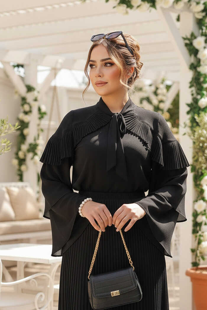 Omuz Fırfır Görünümlü Yaka Bağlamalı Katlı Kol Detay Bluz 5263 Siyah