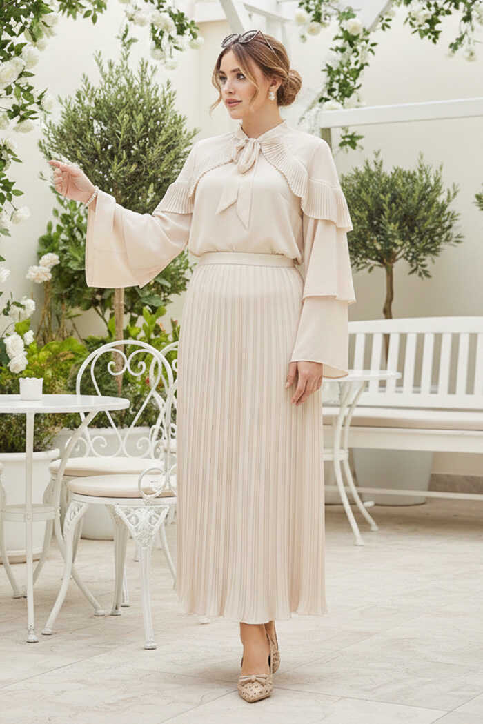 Omuz Fırfır Görünümlü Yaka Bağlamalı Katlı Kol Detay Bluz 5263 Taş