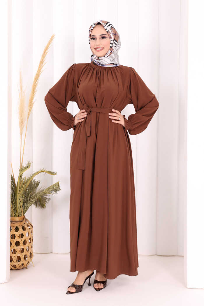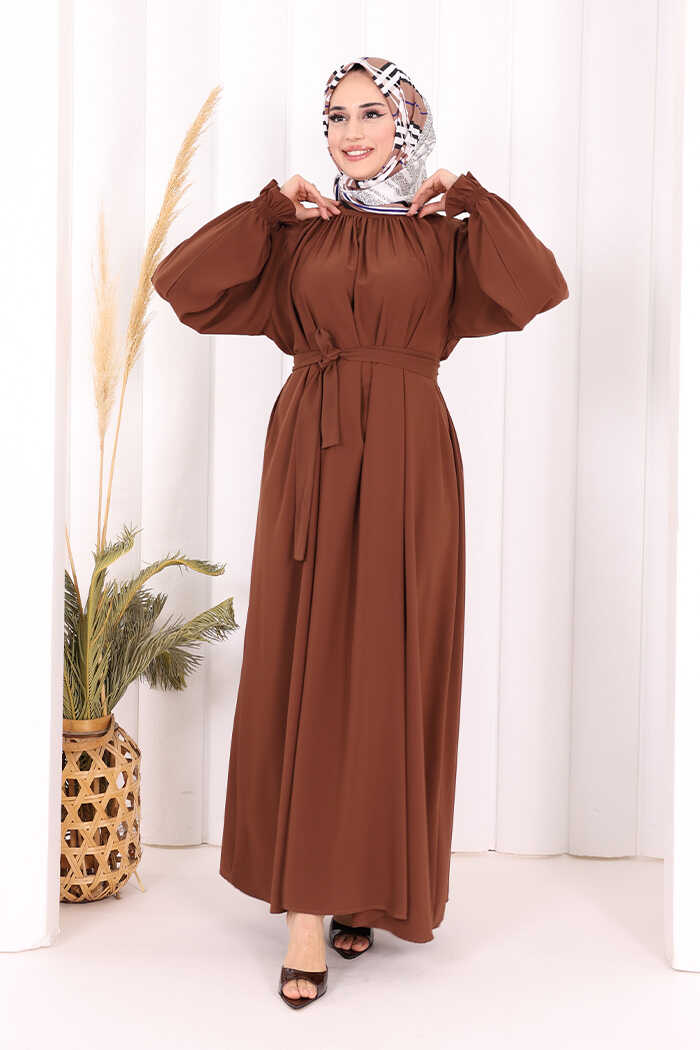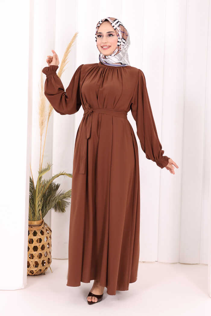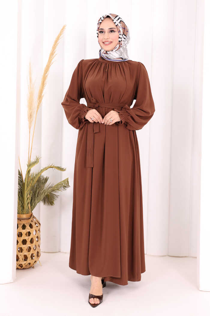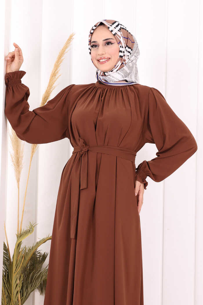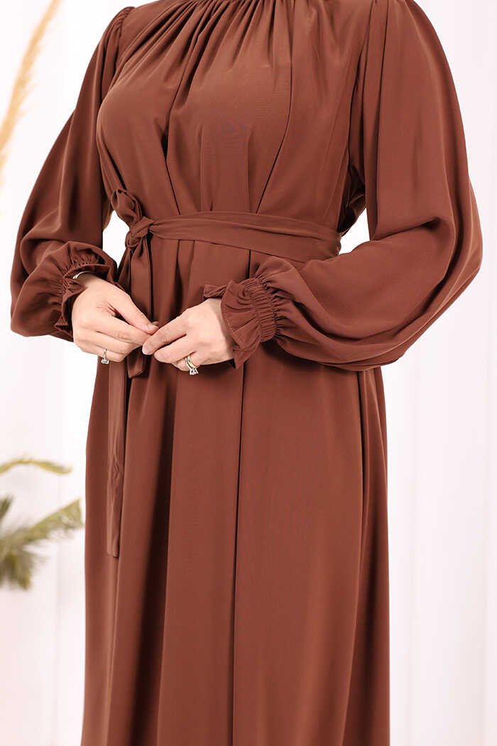 Yaka ve Kol Manşetleri Büzgü Görünümlü Kuşaklı Elbise 6014 Kahverengi