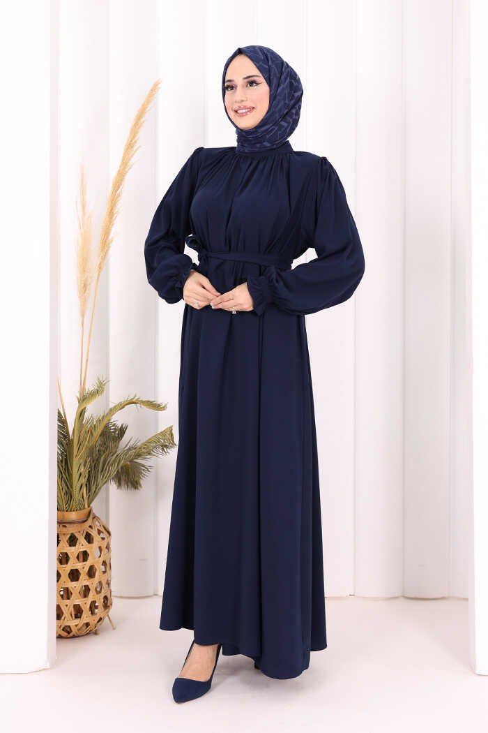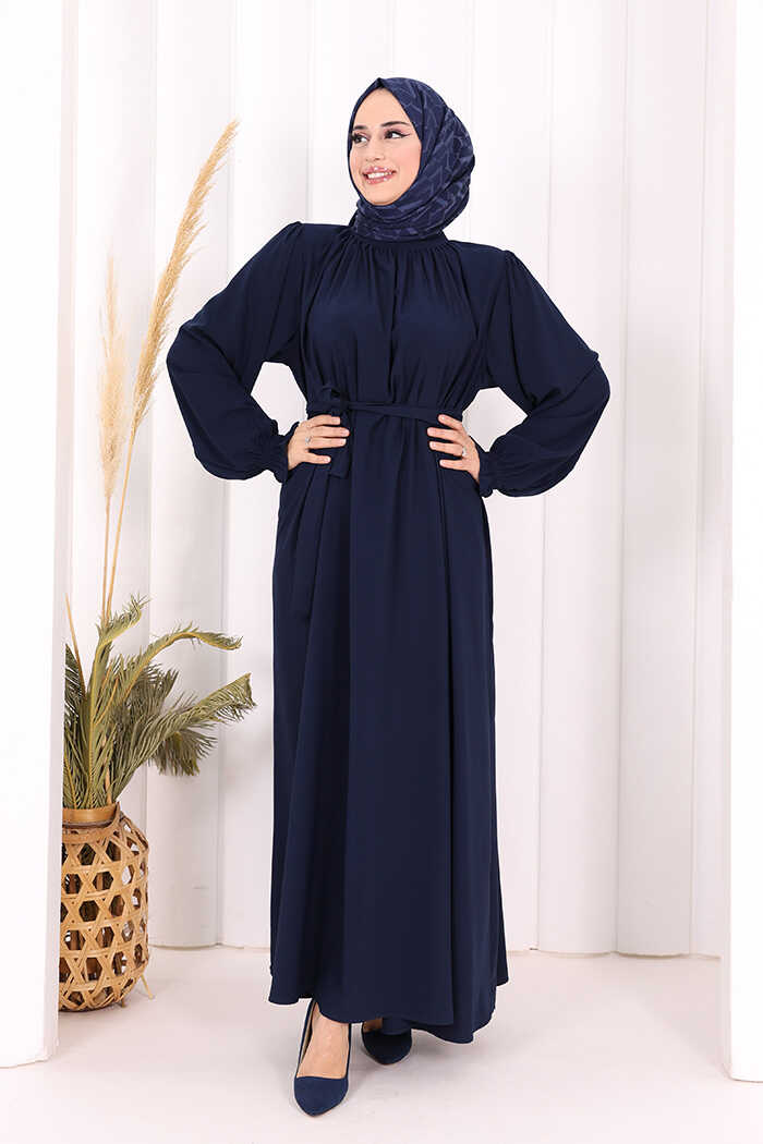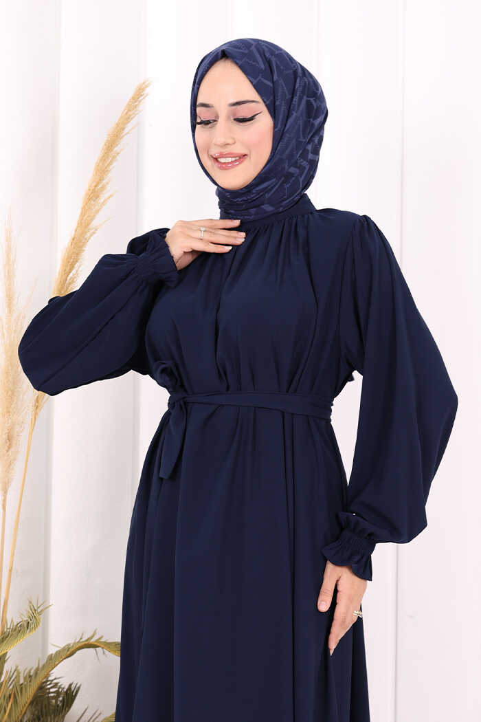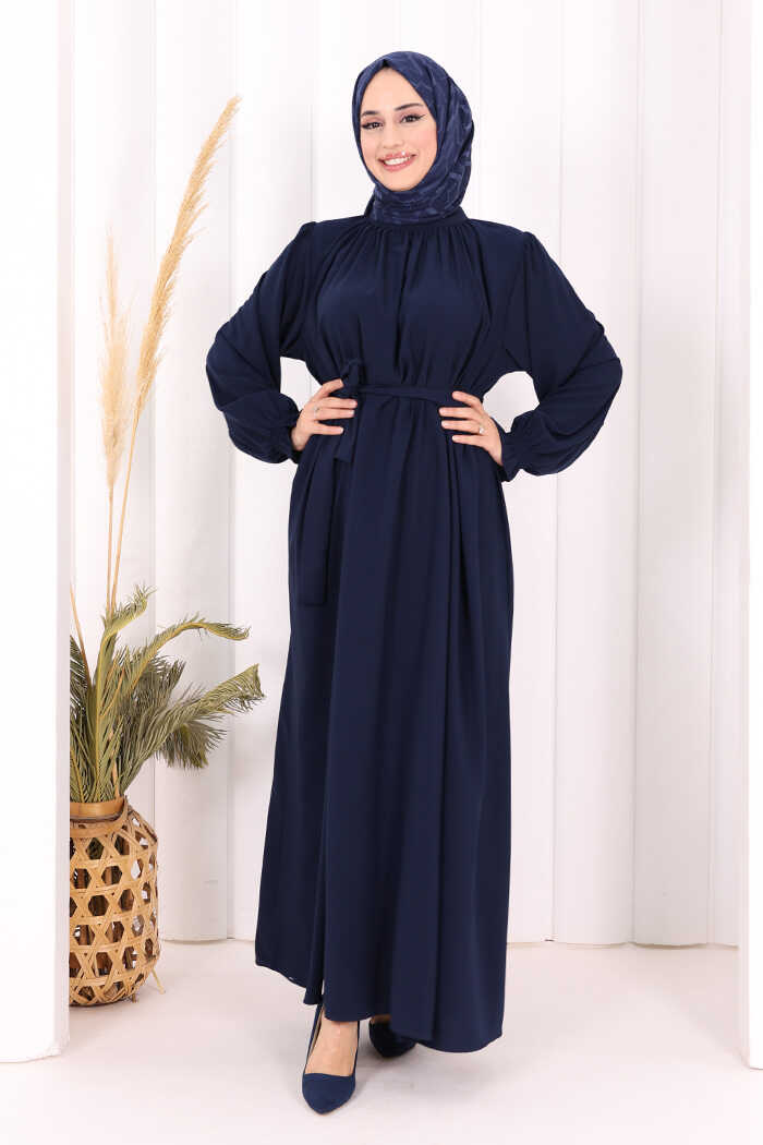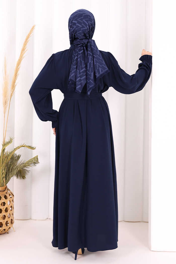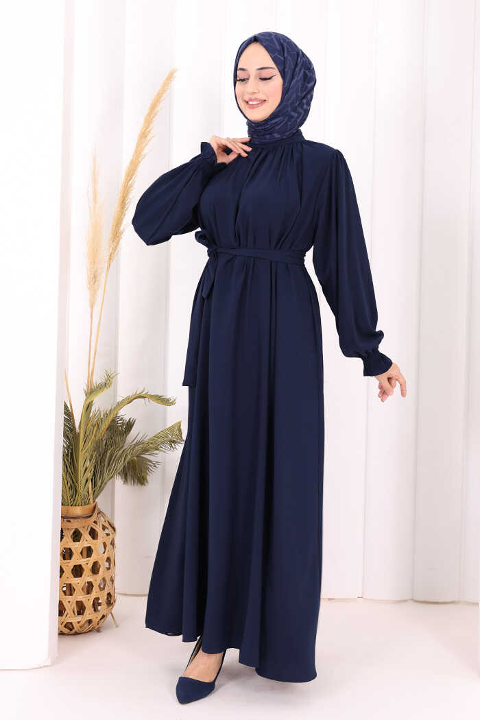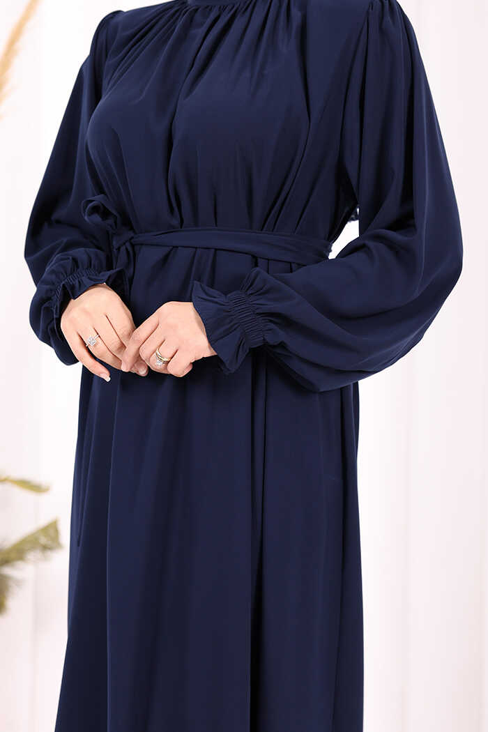 Yaka ve Kol Manşetleri Büzgü Görünümlü Kuşaklı Elbise 6014 Lacivert