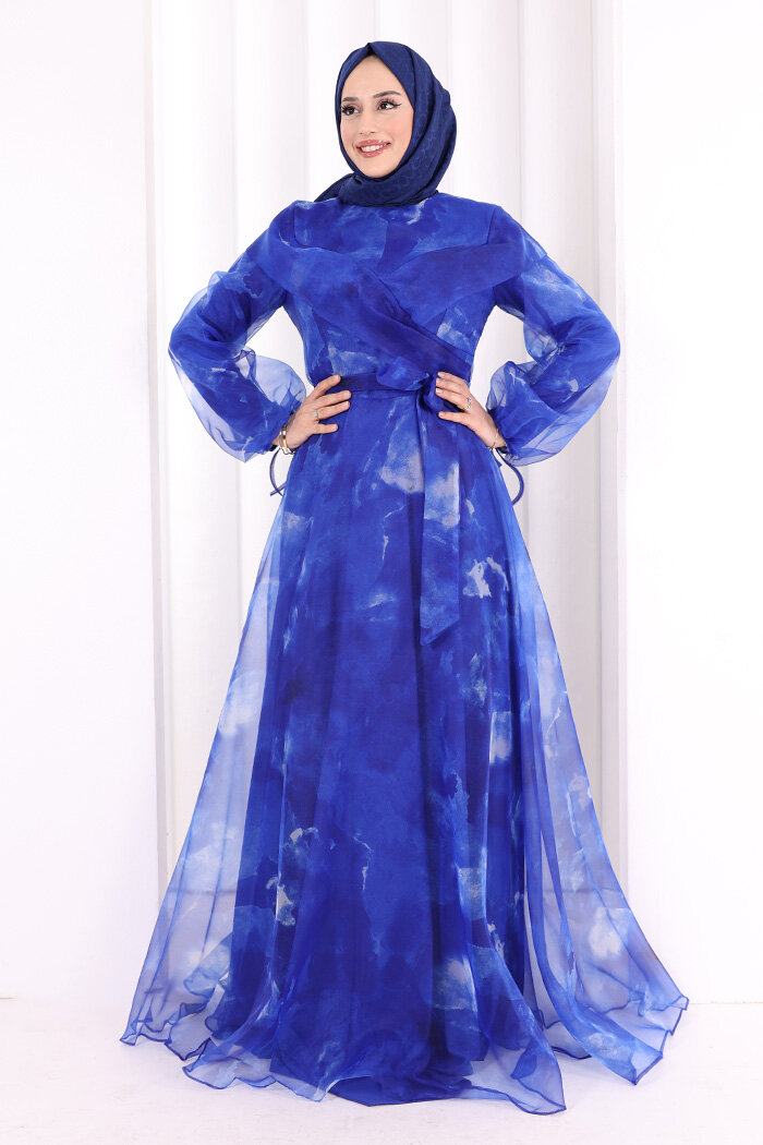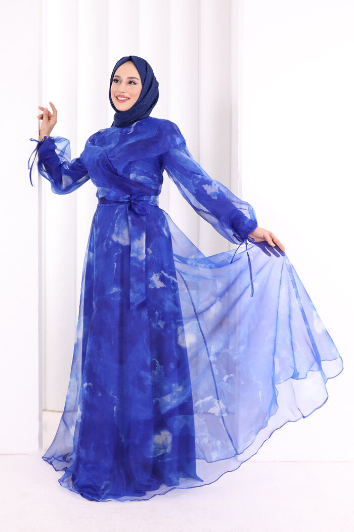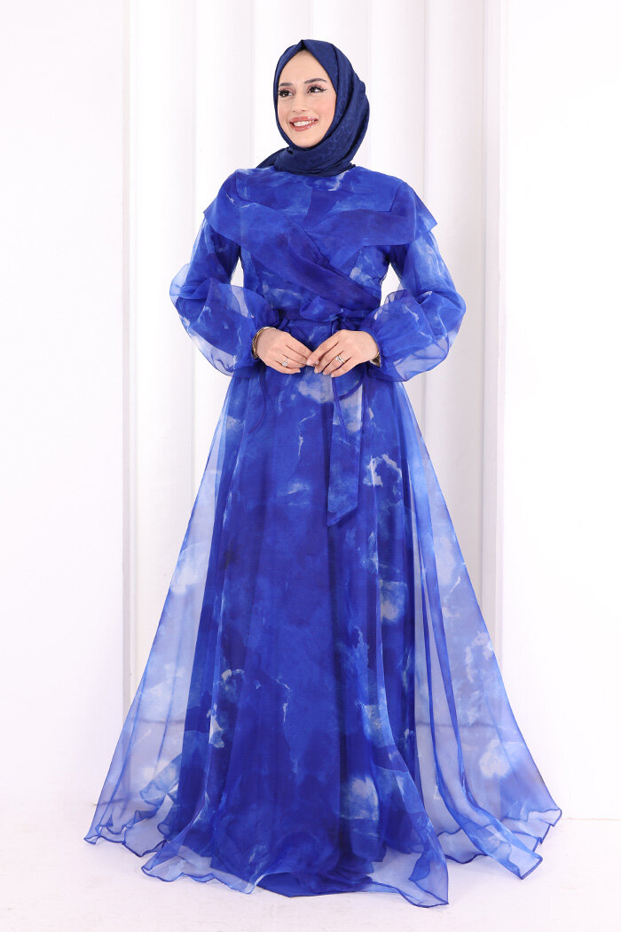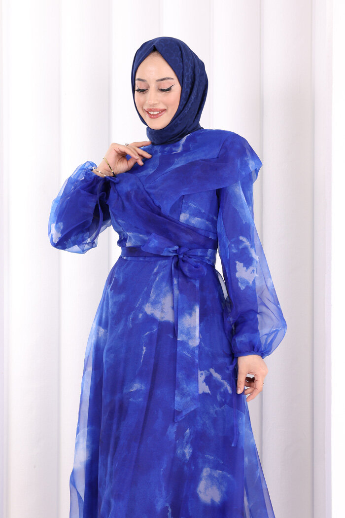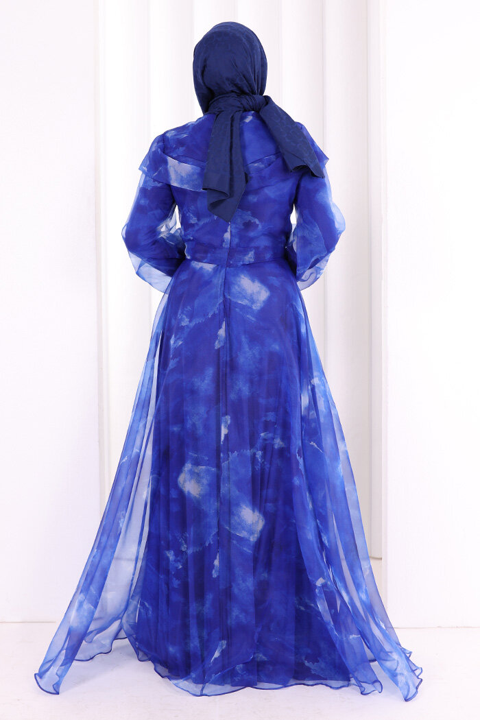 Kendinden Desenli Renkli Tül Abiye 7047 Saks
