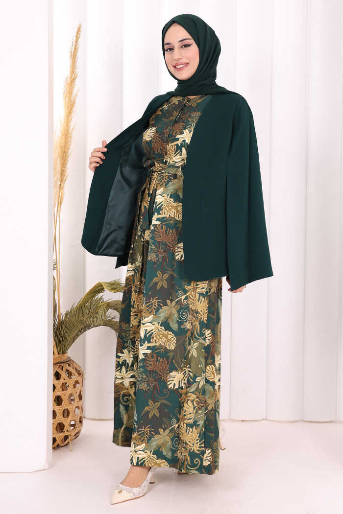 Pelerin Kol Görünümlü Düz Astarlı Ceket 7666 Zümrüt