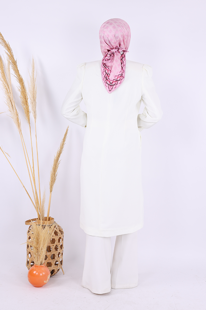 جاكيت بمقاس نصف مزوَّد بأزرار مفصلة جاكيت بتفاصيل زر أمامي مبطن تحت الركبة. طوق مفصل. قماش كريب إنه في نطاق حجم 38/46. حجم العارضات لدينا هو 38 ، وطولها 165-170 سم في المتوسط ، وهي في حدود 55-60 كجم.