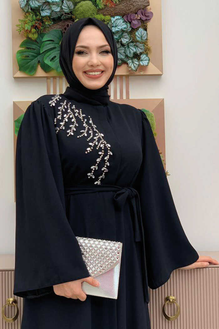 Schultersteinbestickte Taillenkrawatte Abaya 7805 Schwarz