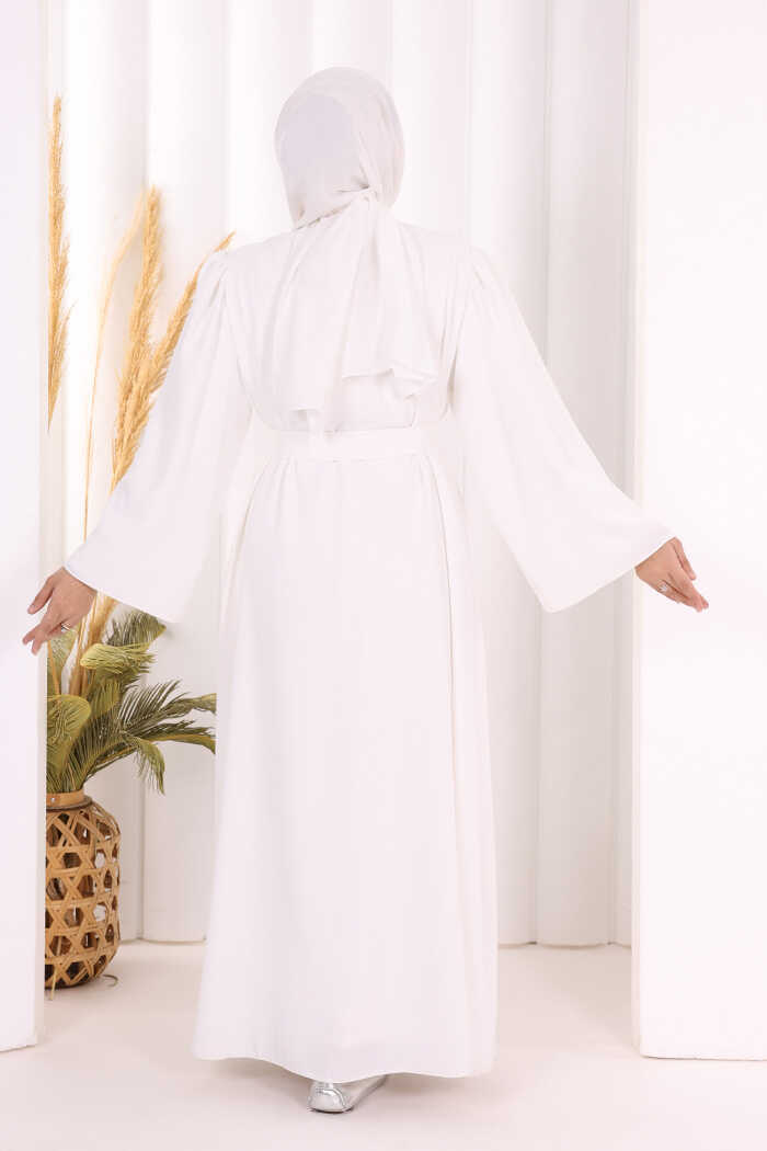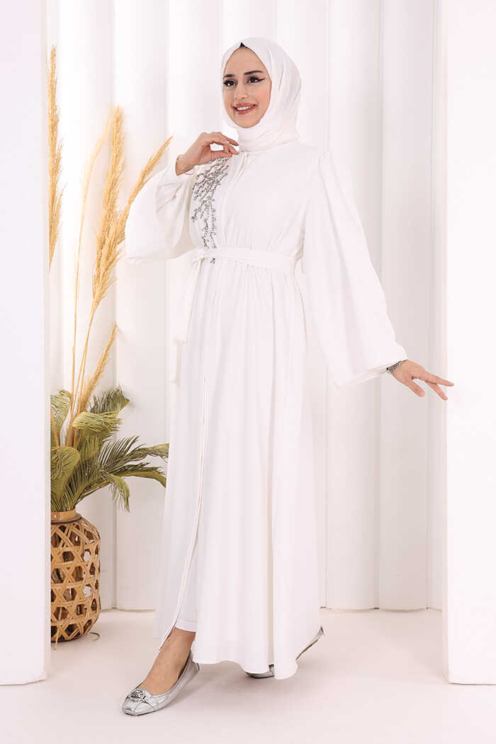 Omuz Taş İşlemeli Bel Bağlamalı Ferace 7805 Ekru