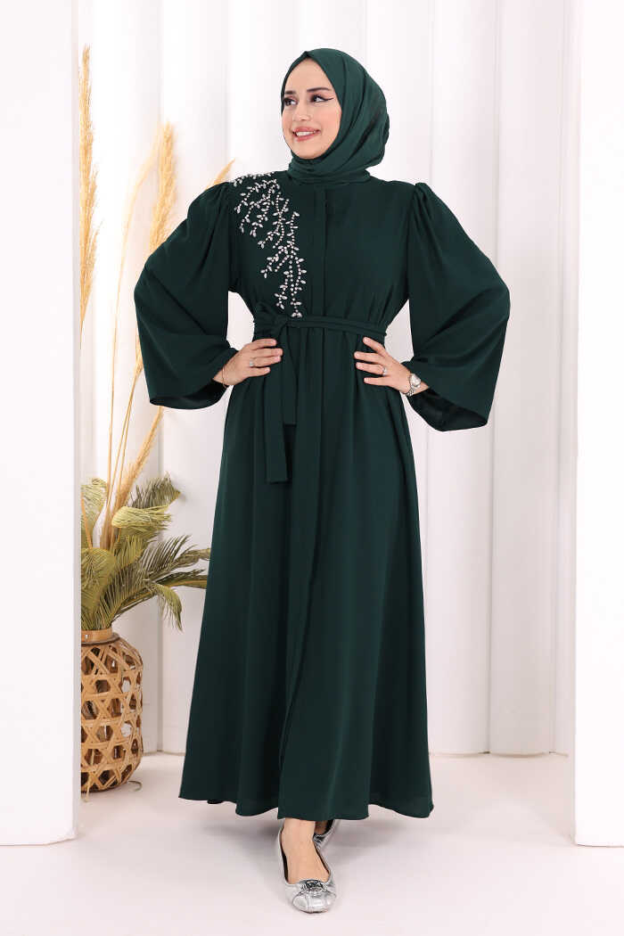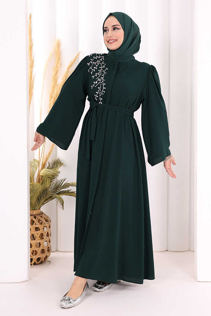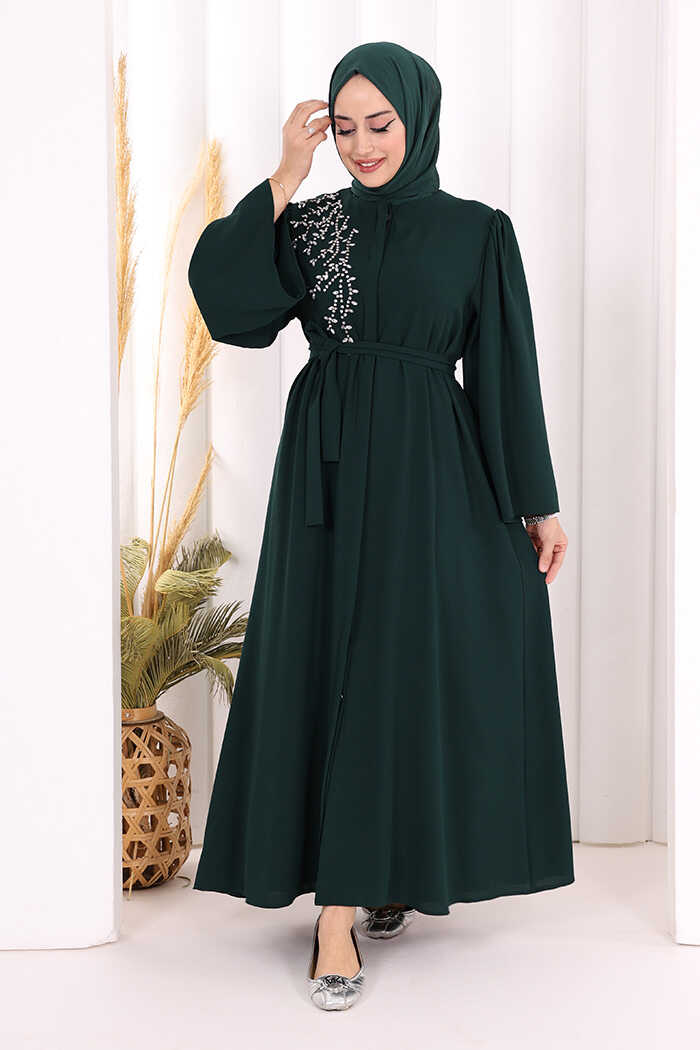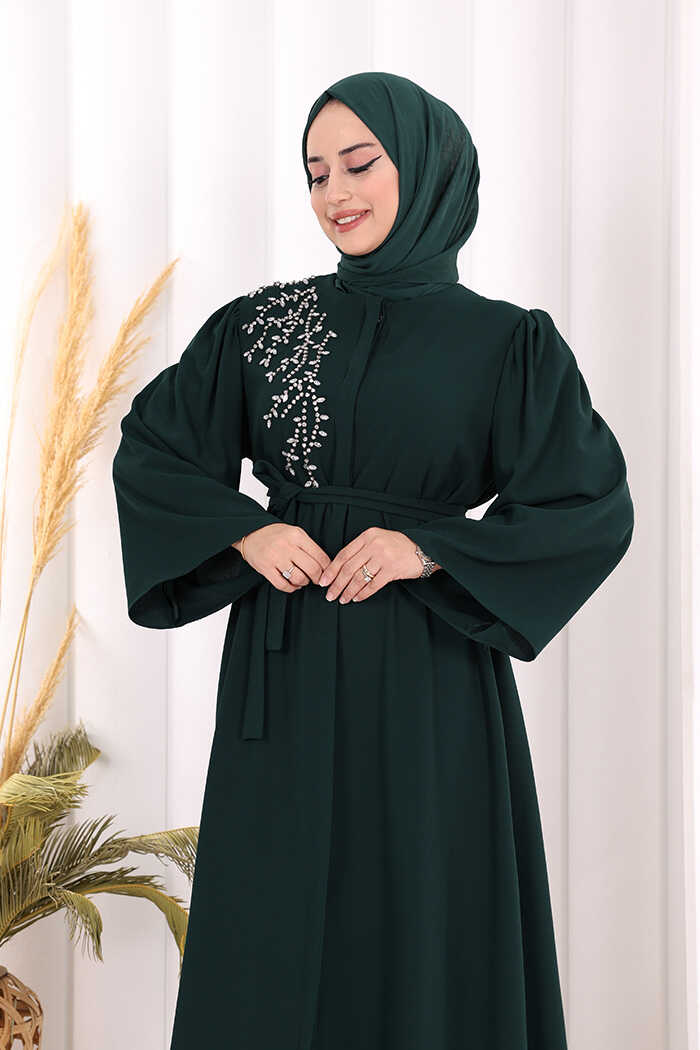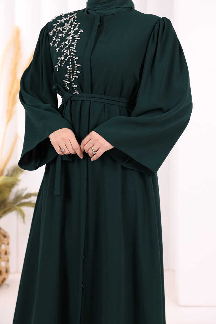 Omuz Taş İşlemeli Bel Bağlamalı Ferace 7805 Zümrüt