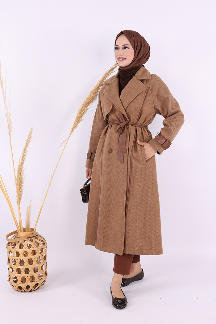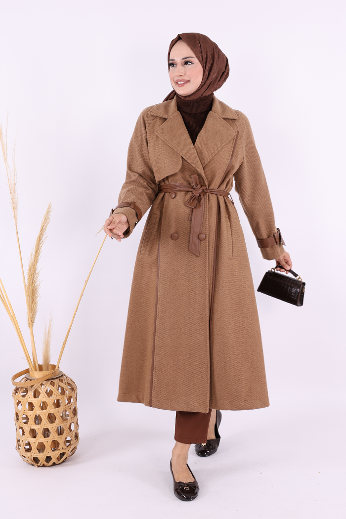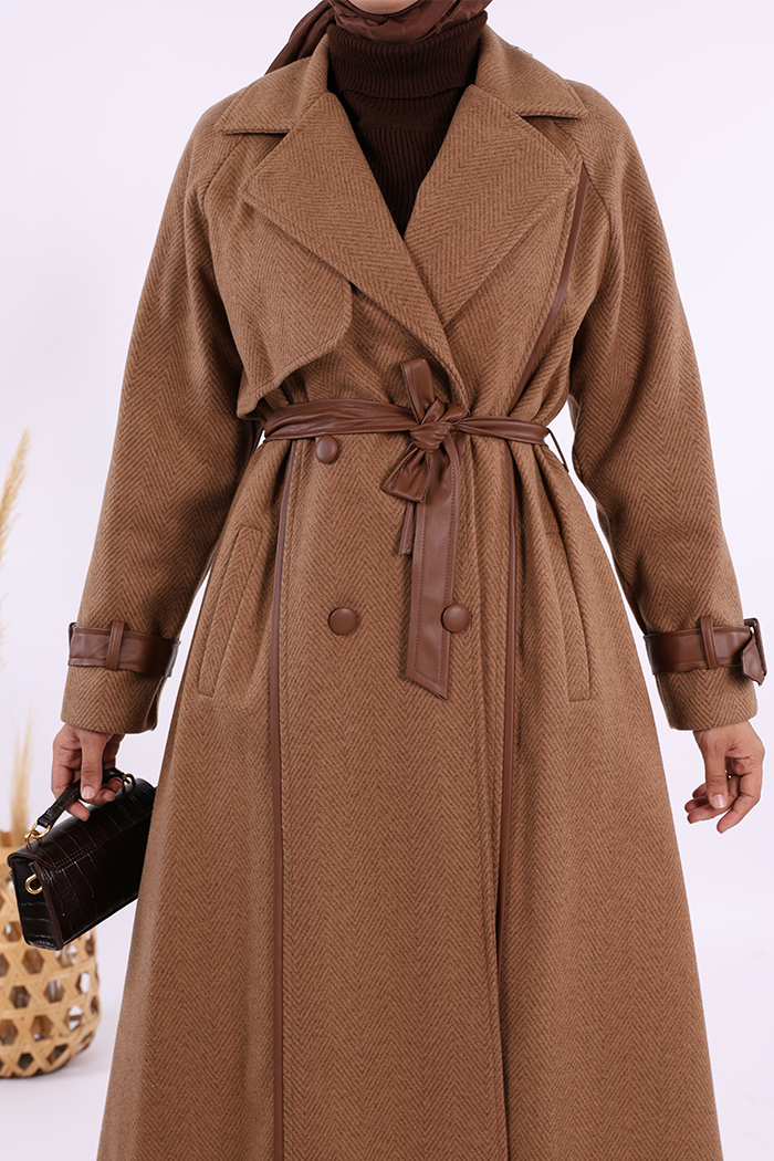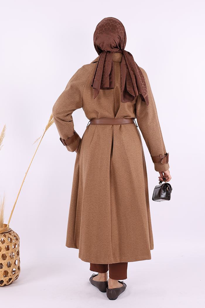 ASTARLI DERİ DETAY BEL KUŞAKLI KAŞE KABAN: