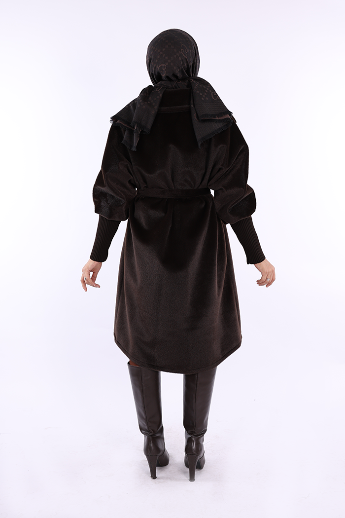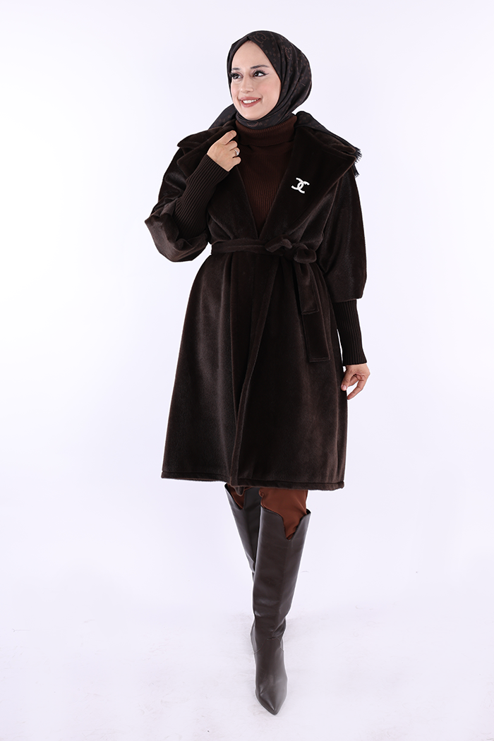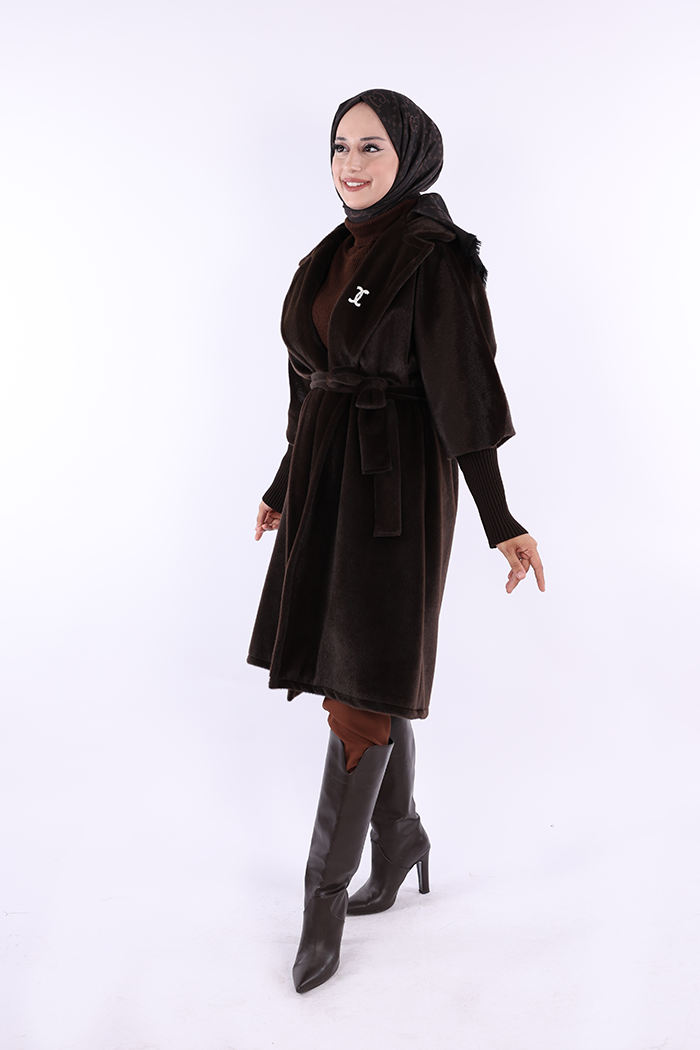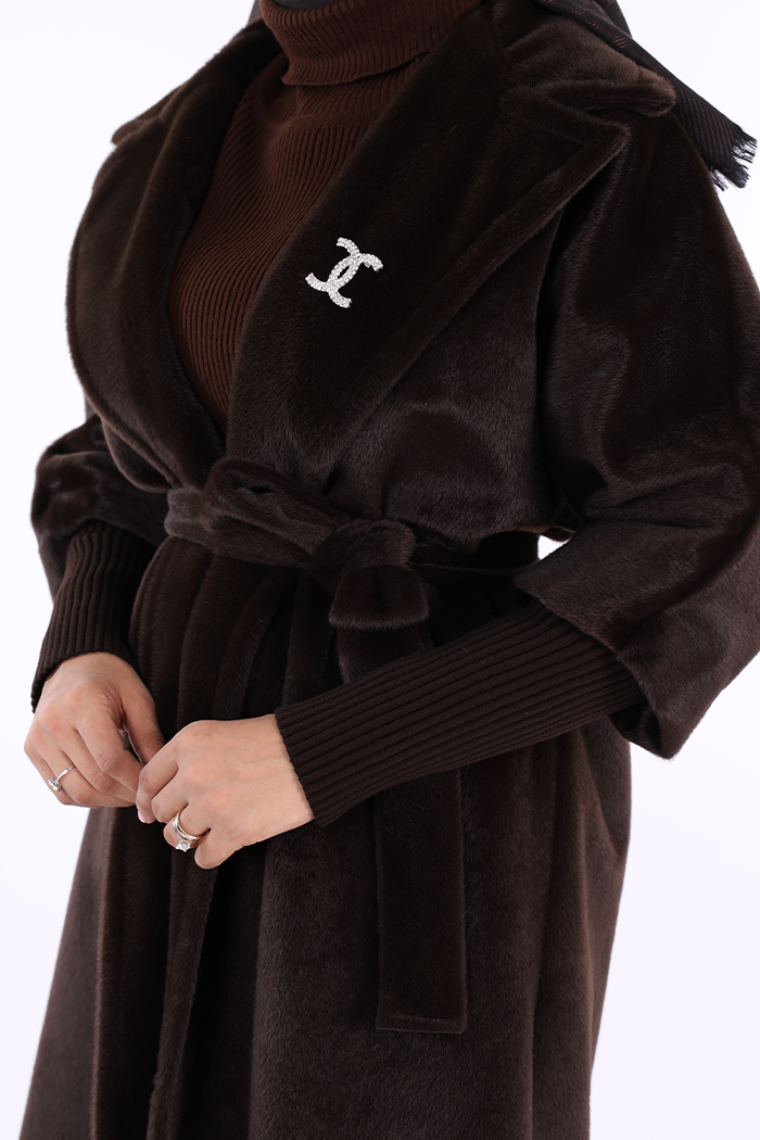 BEL KUŞAKLI YAKA TAŞ BROŞ DETAYLI KABAN: