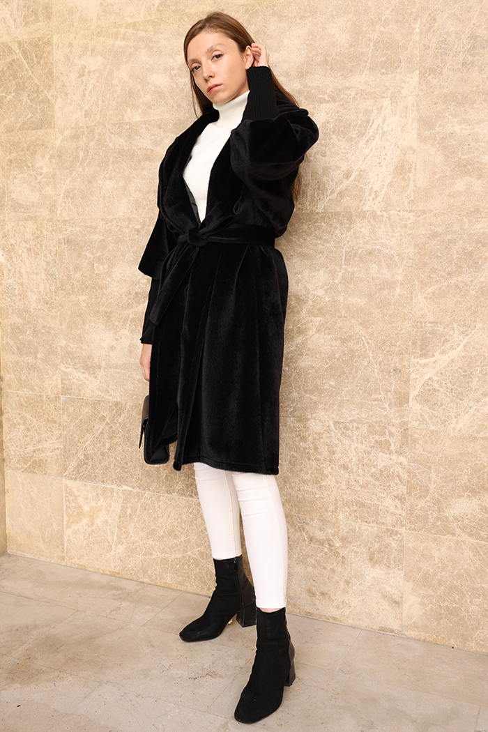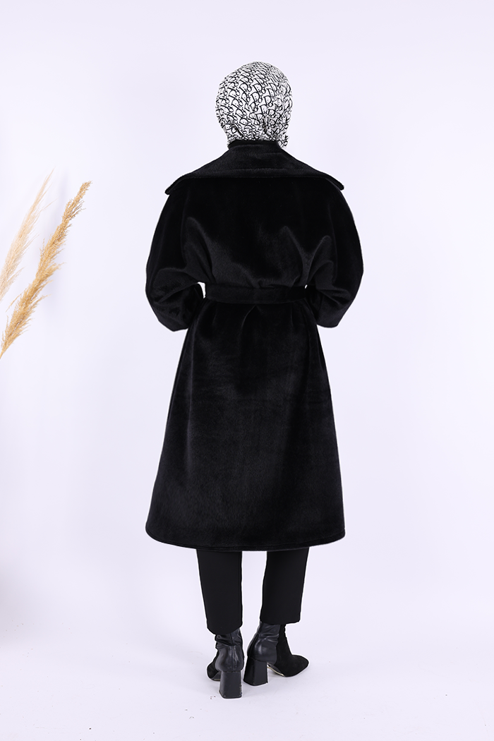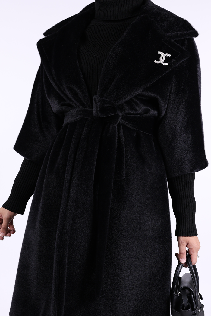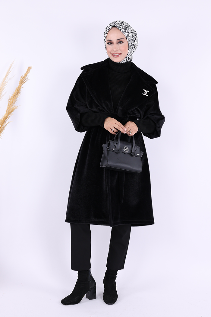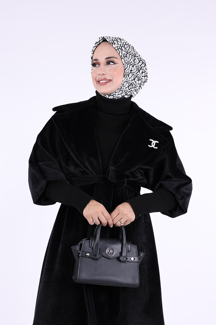 Bel Kuşaklı Yaka Taş Broş Detaylı Kaban 7874 Siyah