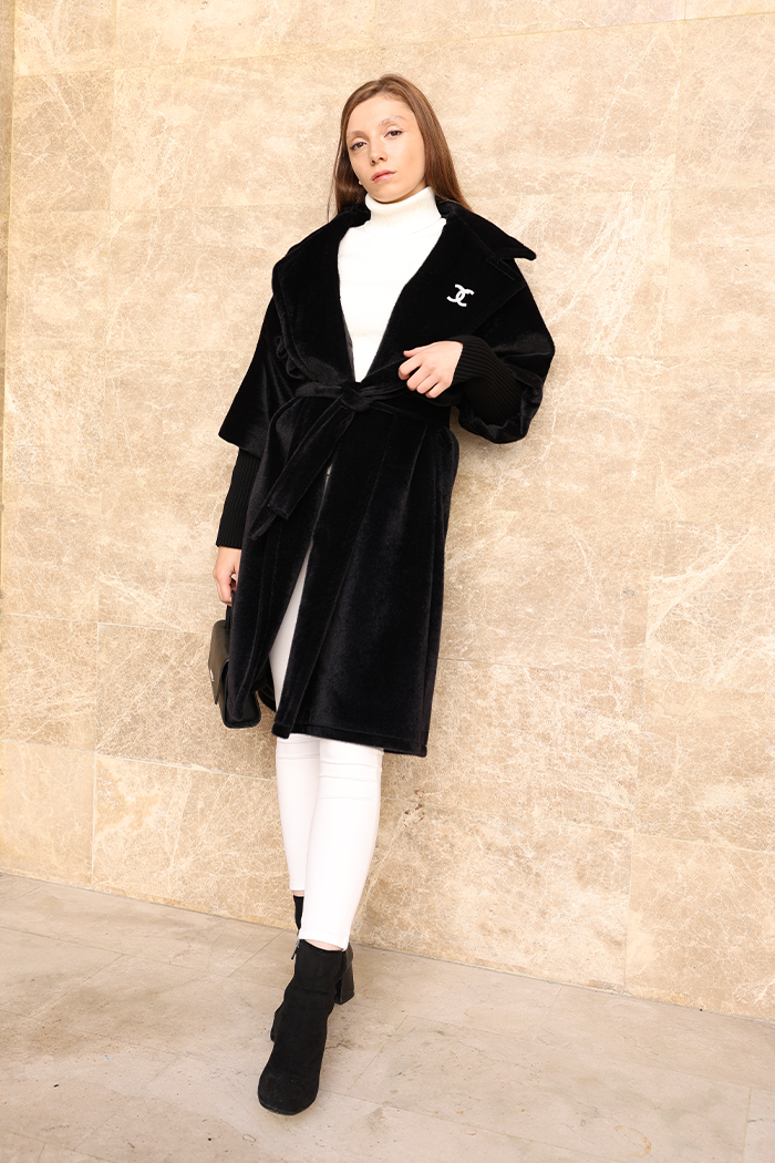 BEL KUŞAKLI YAKA TAŞ BROŞ DETAYLI KABAN:
