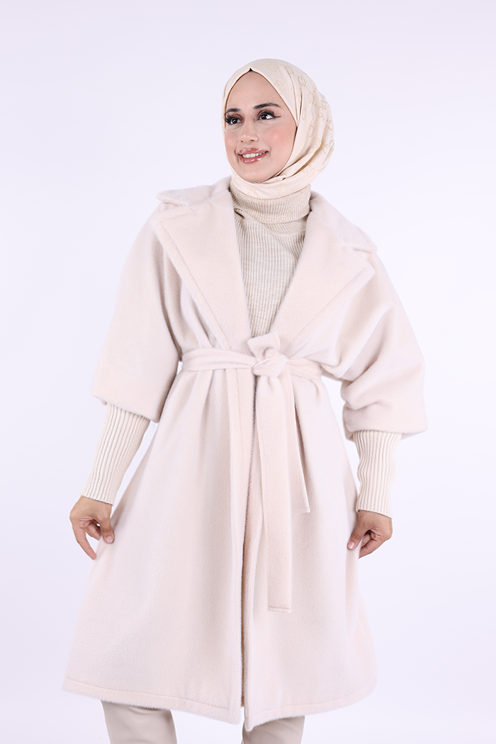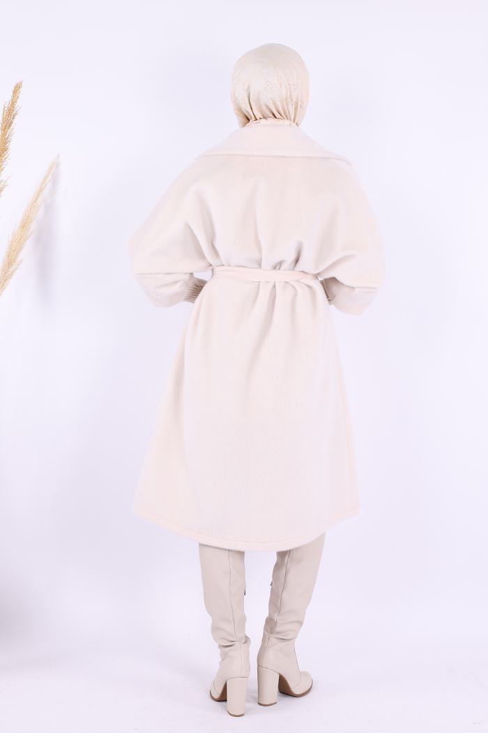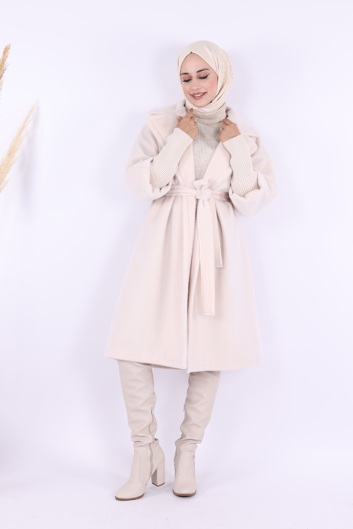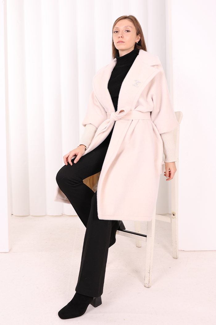 Bel Kuşaklı Yaka Taş Broş Detaylı Kaban 7874 Taş