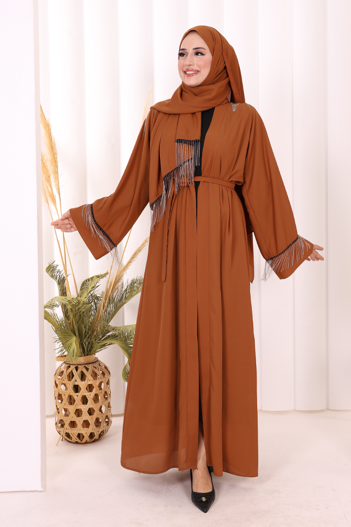 Zincir Püskül Detay Şallı Abaya 7887 Taba