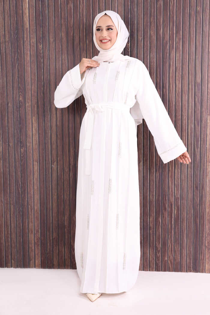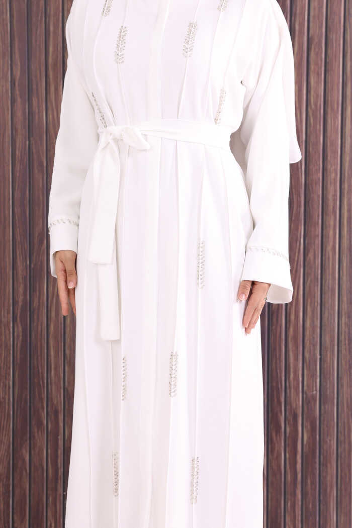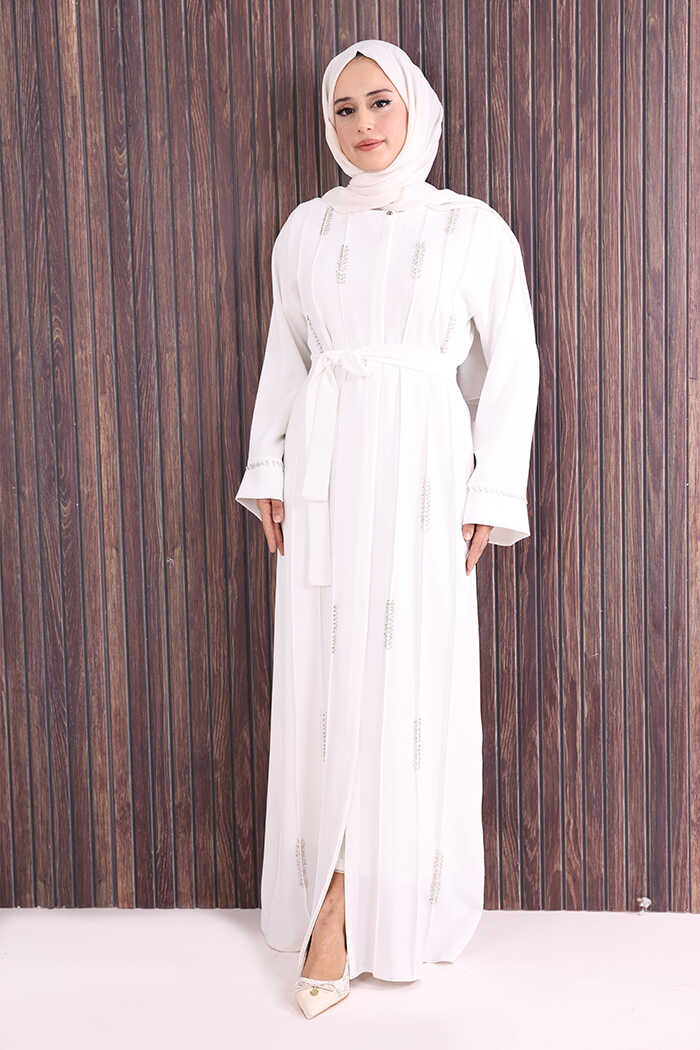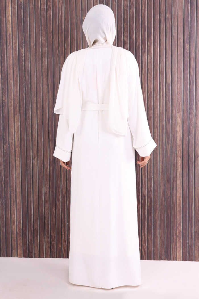 Boncuk İşlemeli Tam Boy Ferace 7894 Ekru