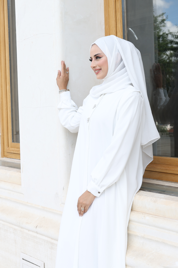 Boydan Düğmeli Taş İşleme Detaylı Ferace 7903 Ekru