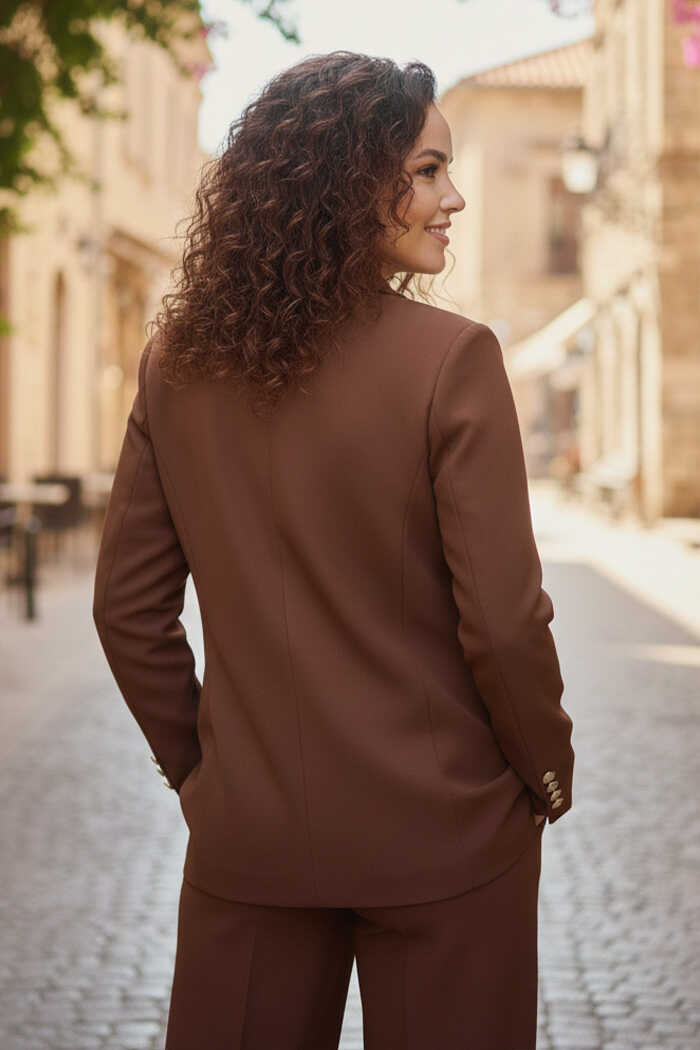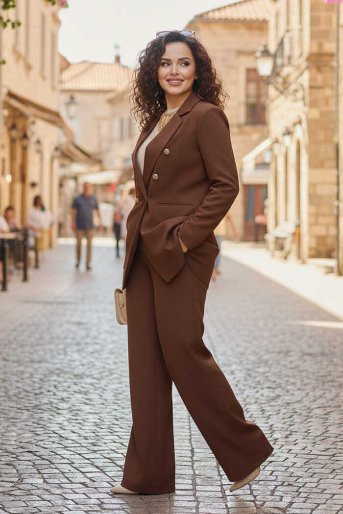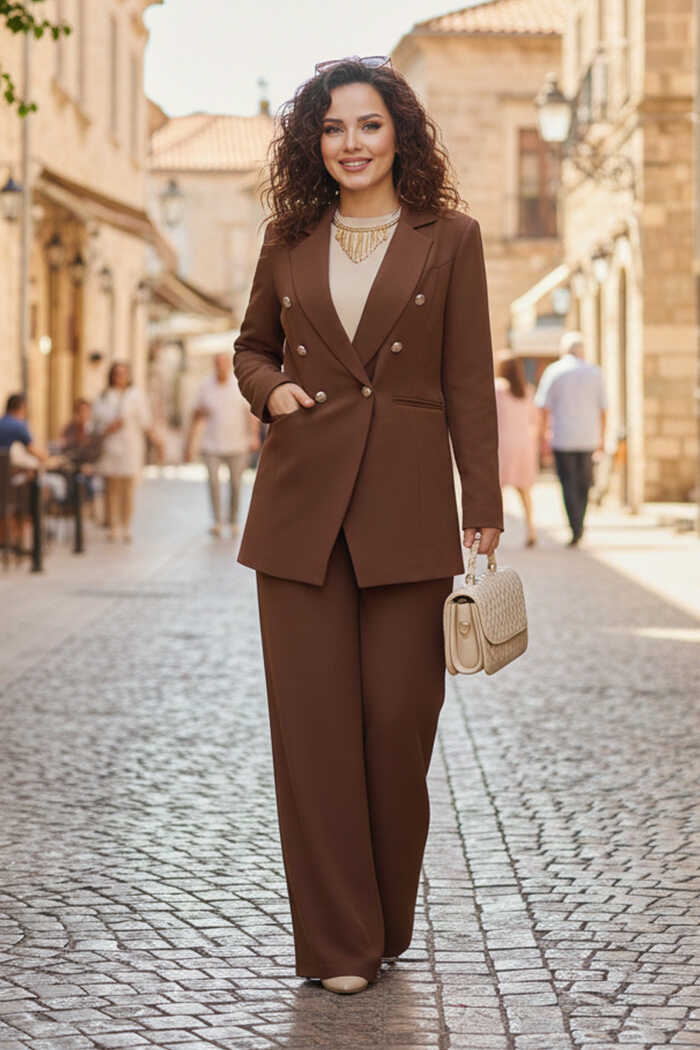 Düğme Detay Blazer Ceket Bol Pantolon Takım 8302 Kahverengi