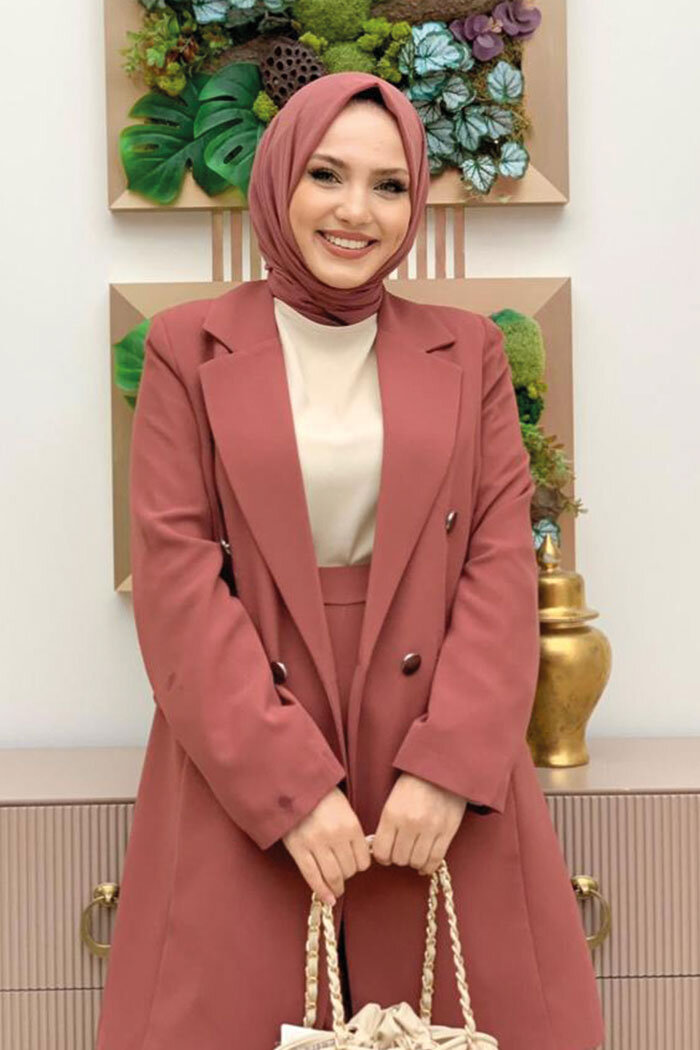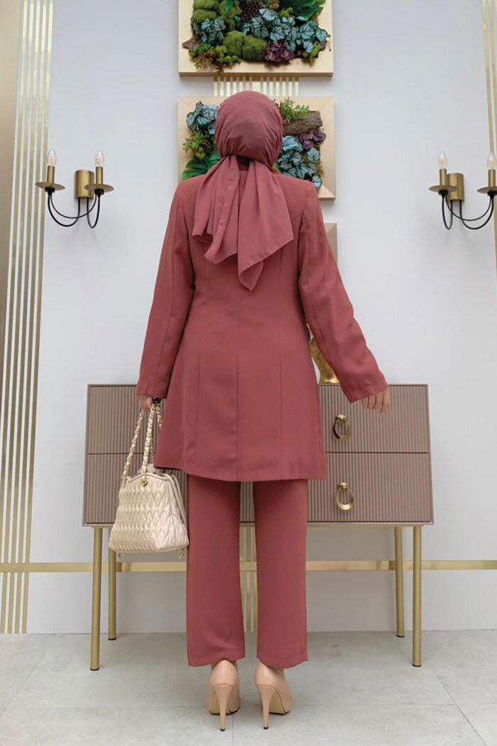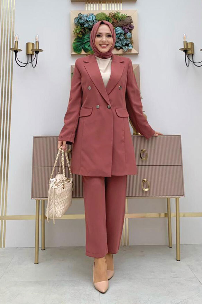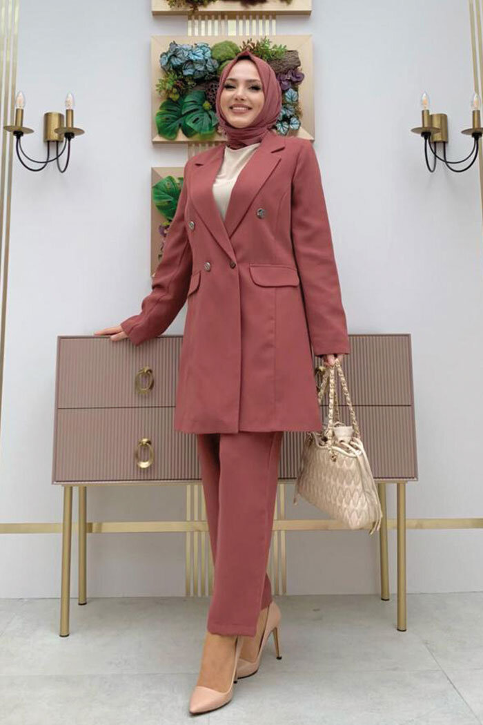 Düğme Detaylı Kısa Ceket Pantolon Takım 8352 Gül Kurusu