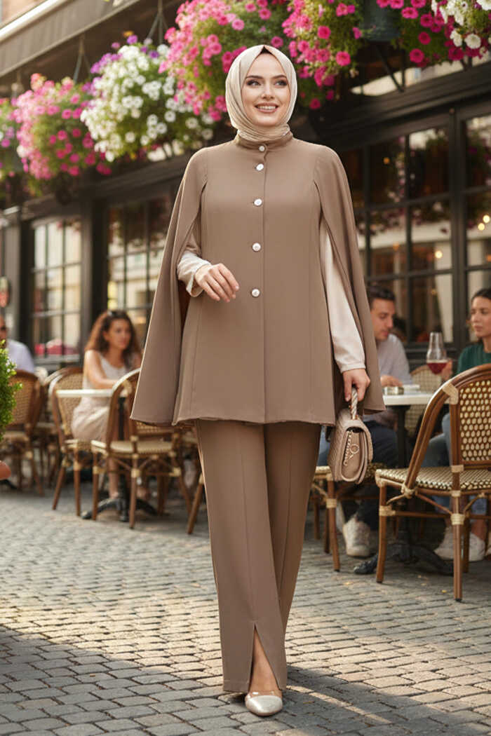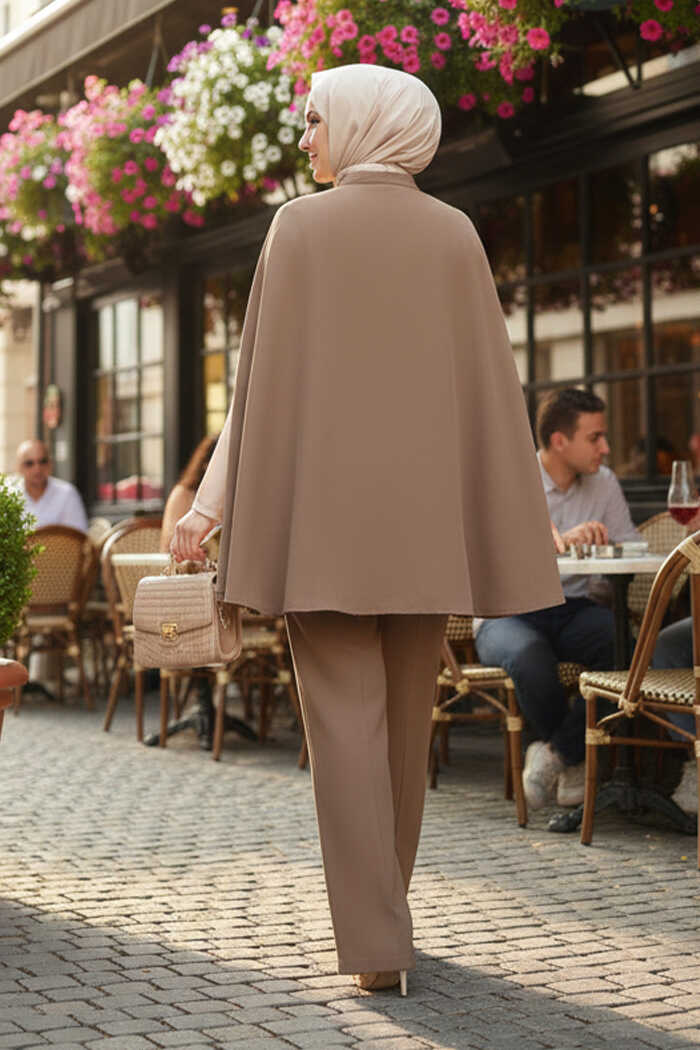 Pelerinli Düğme Detay Ceket ve Pantolon Takım 8354 Vizon