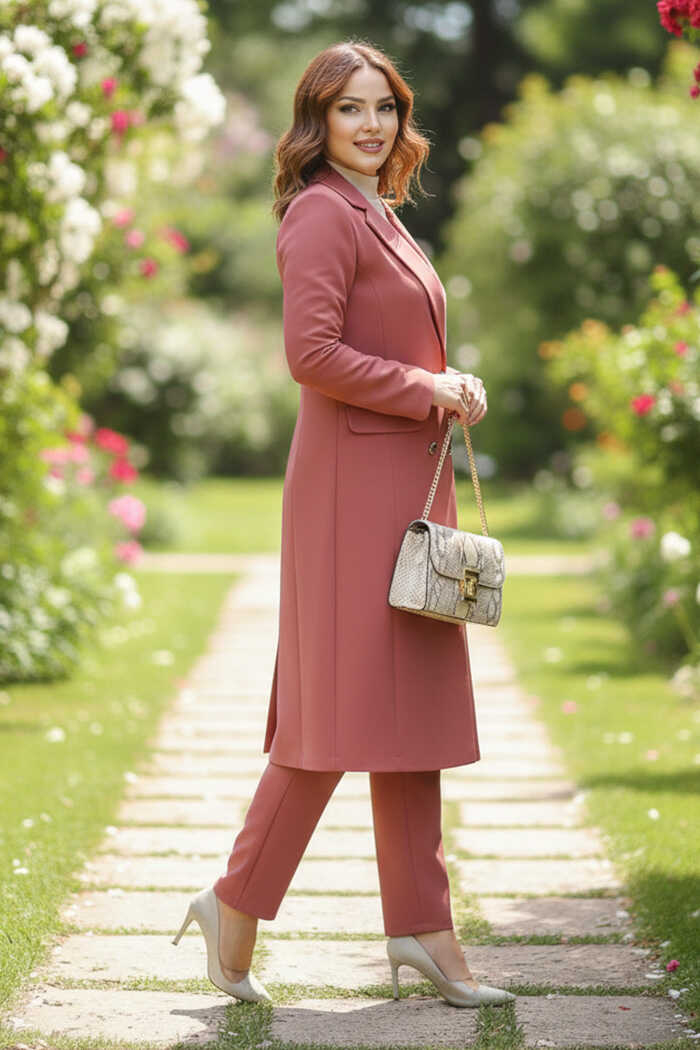 Cep ve Düğme Görünümlü Uzun Ceket Pantolon Takım 8357 Gül Kurusu