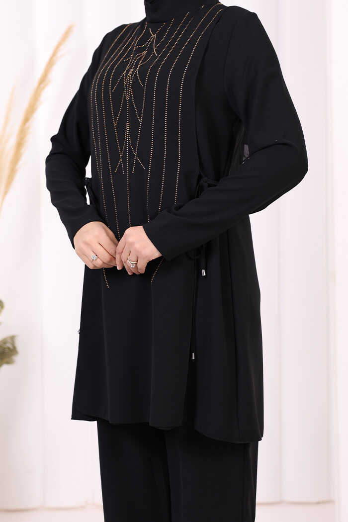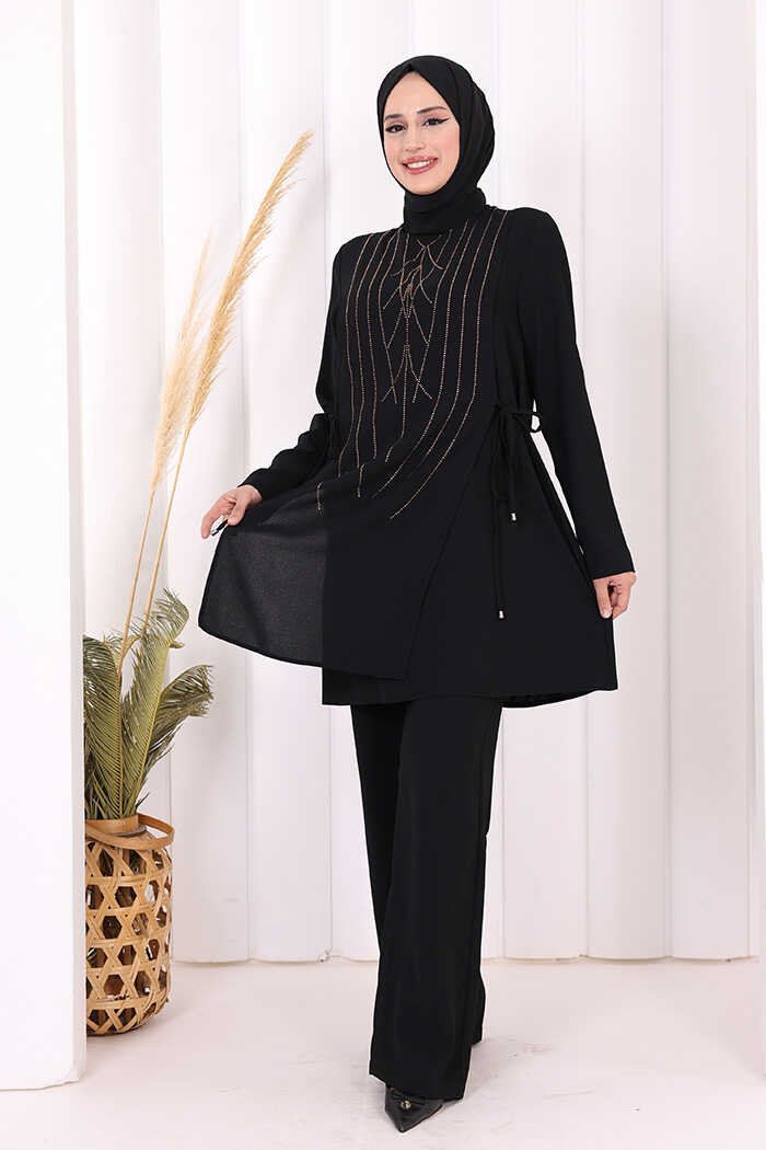 Taş Baskı Desenli Tunik Pantolon Takım 8447 Siyah