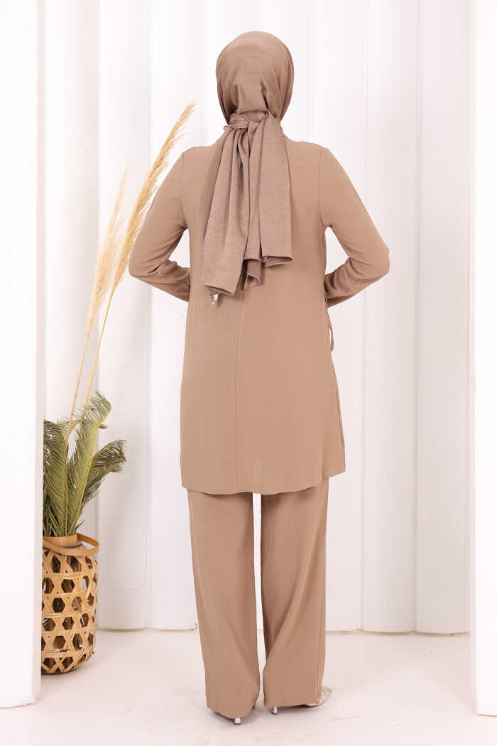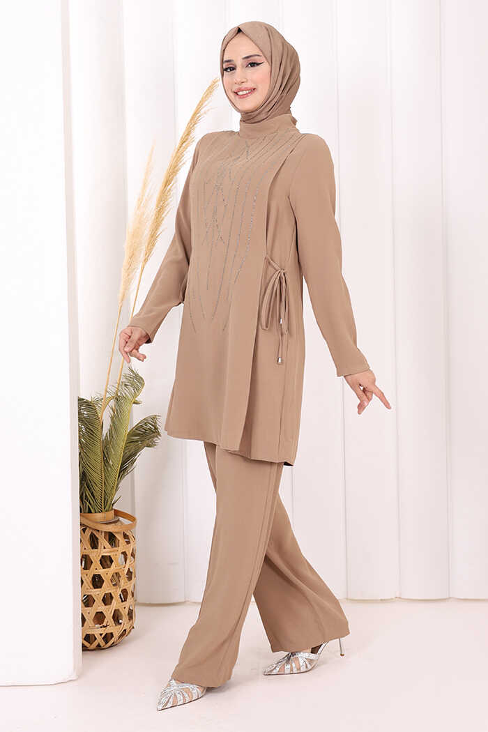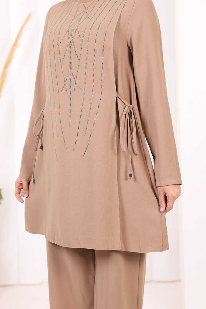 Taş Baskı Desenli Tunik Pantolon Takım 8447 Vizon