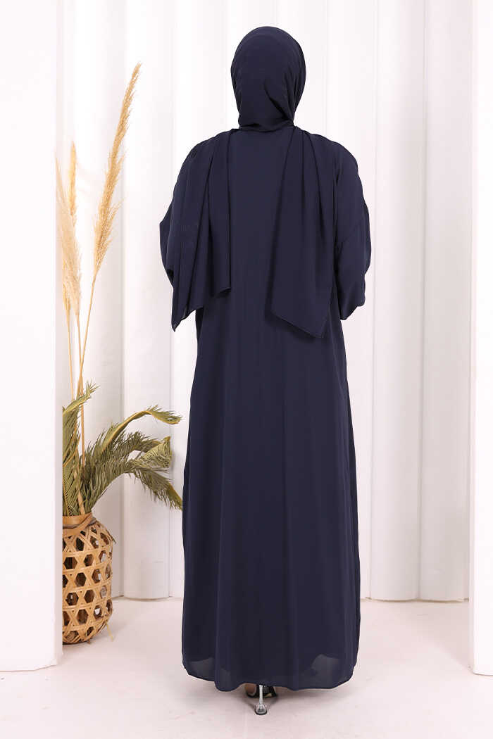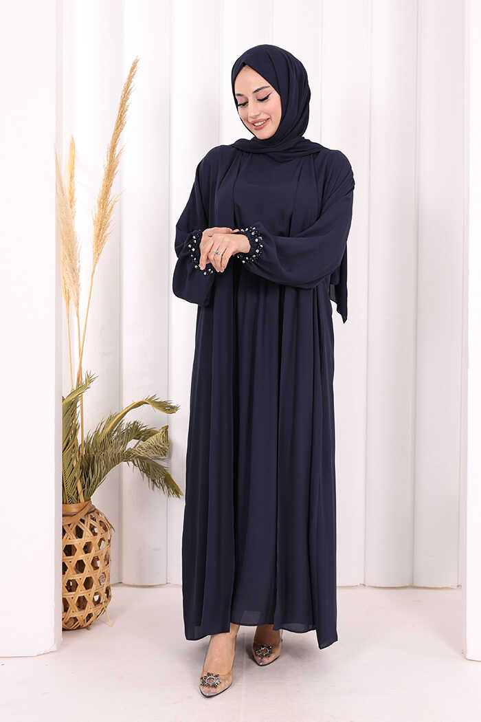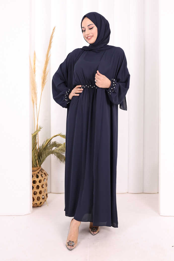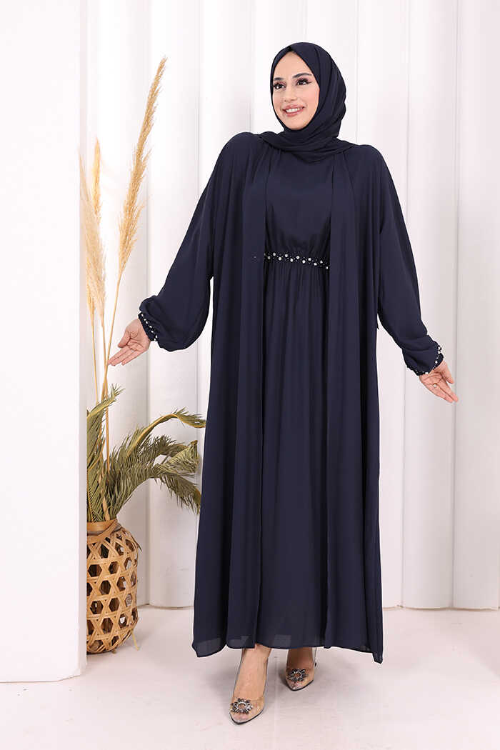 Bel Bilek Kısımları Taşlı Elbiseli Abaya Takım 8490 Lacivert