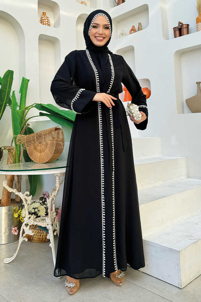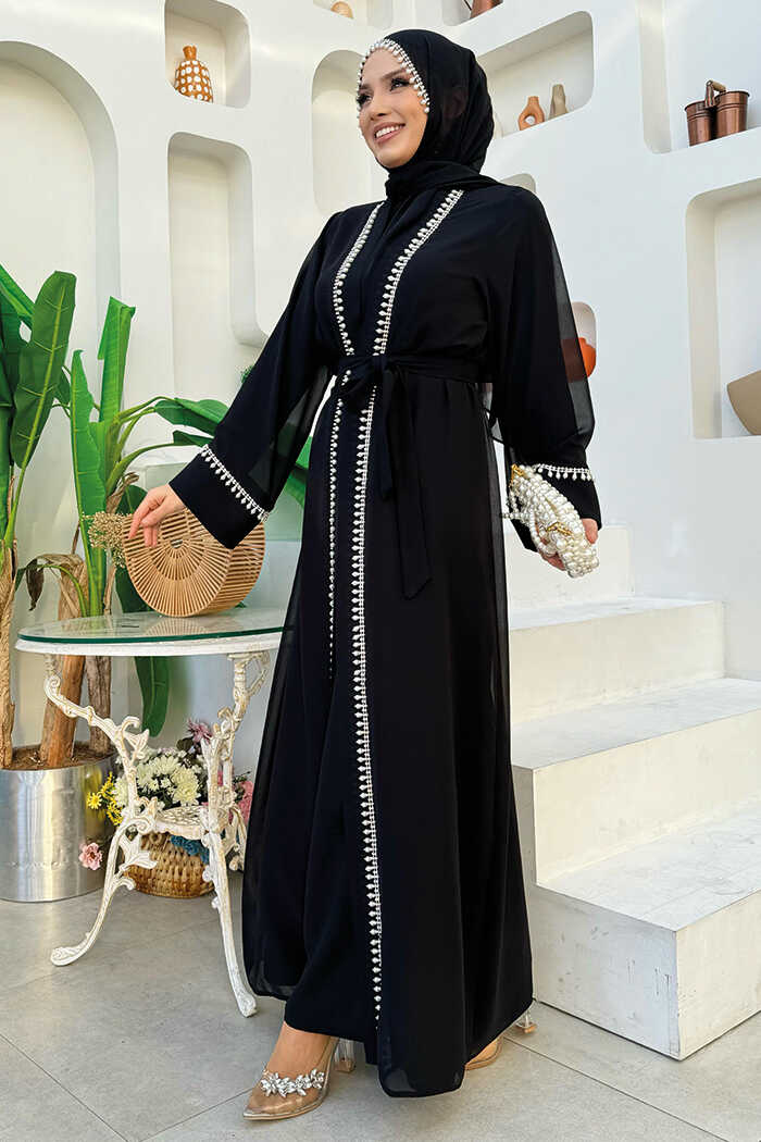 İnci Detaylı Abaya Elbise Takım 8493 Siyah