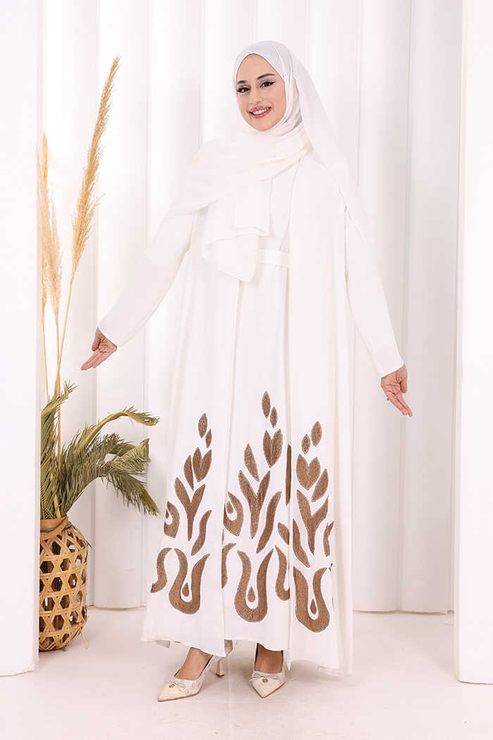 Etek Kısmı Desenli Elbiseli Abaya Takım 8495 Ekru
