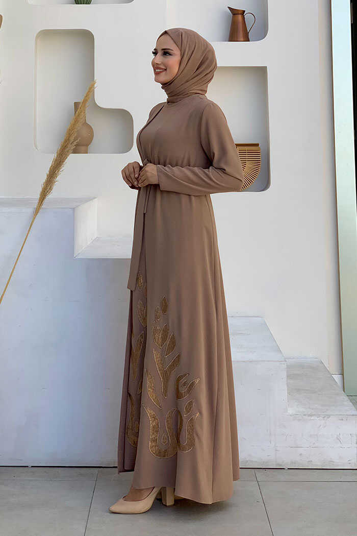 Etek Kısmı Desenli Elbiseli Abaya Takım 8495 Vizon