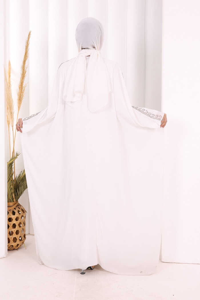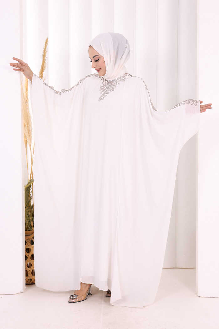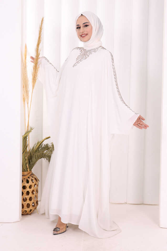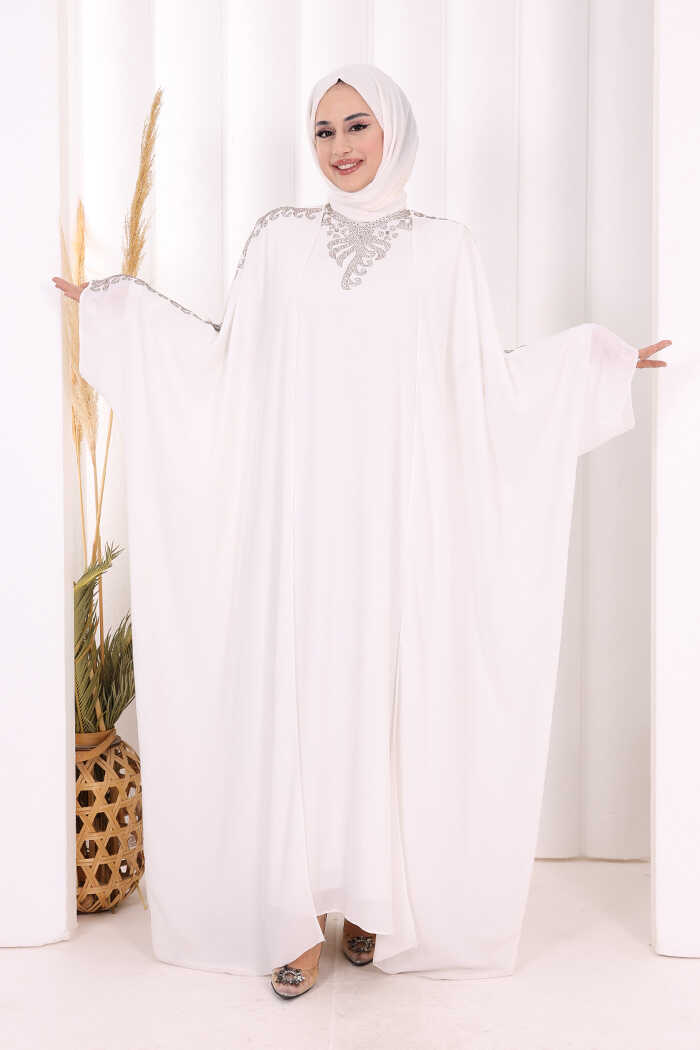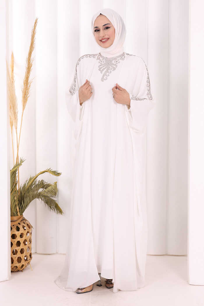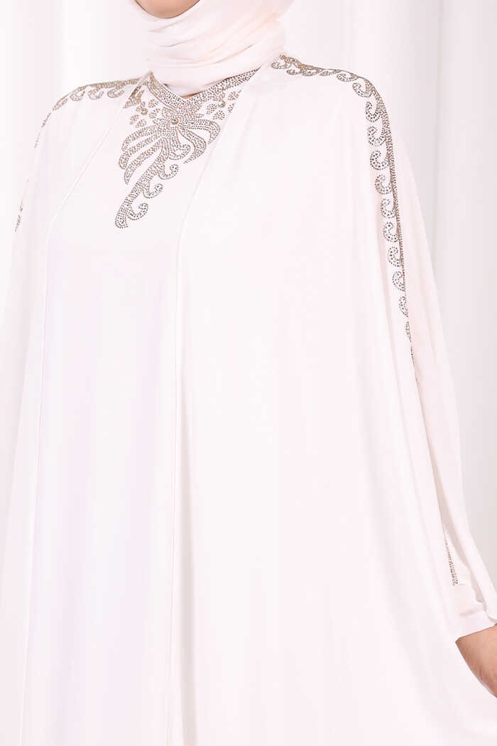 Taş İşlemeli Elbiseli Abaya Takım 8499 Ekru