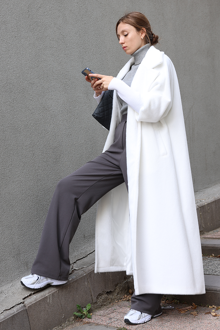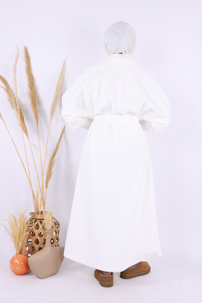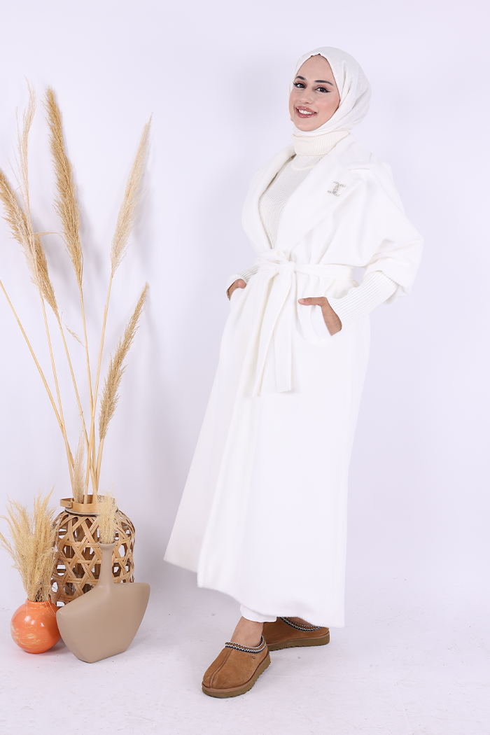 BEL KUŞAKLI YAKA TAŞ BROŞ DETAYLI UZUN KABAN: