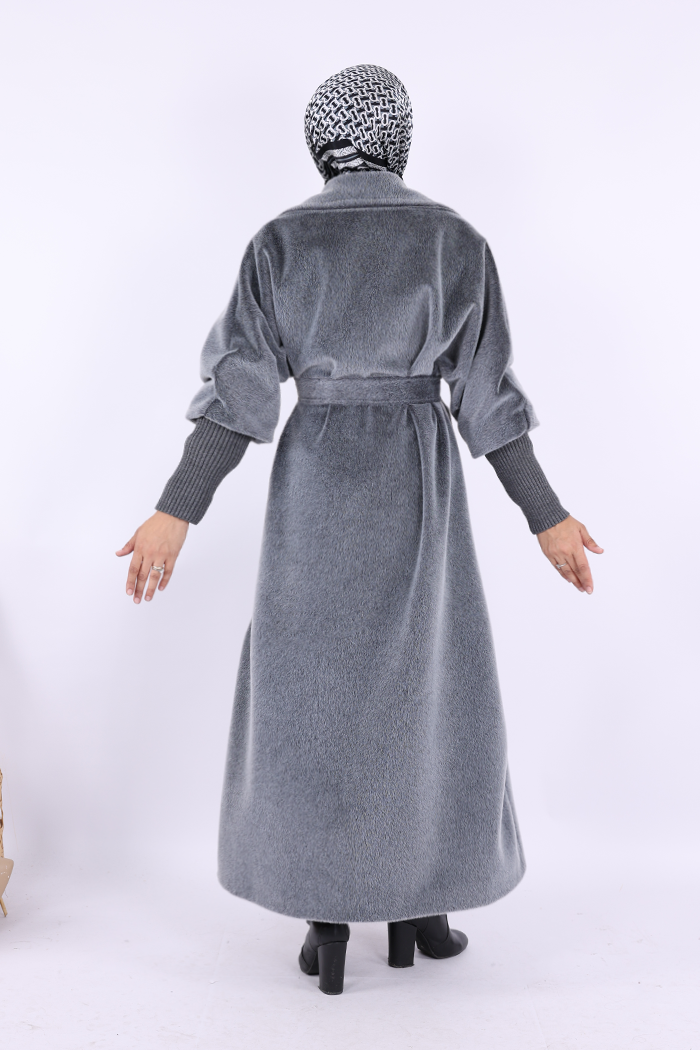 BEL KUŞAKLI YAKA TAŞ BROŞ DETAYLI UZUN KABAN: